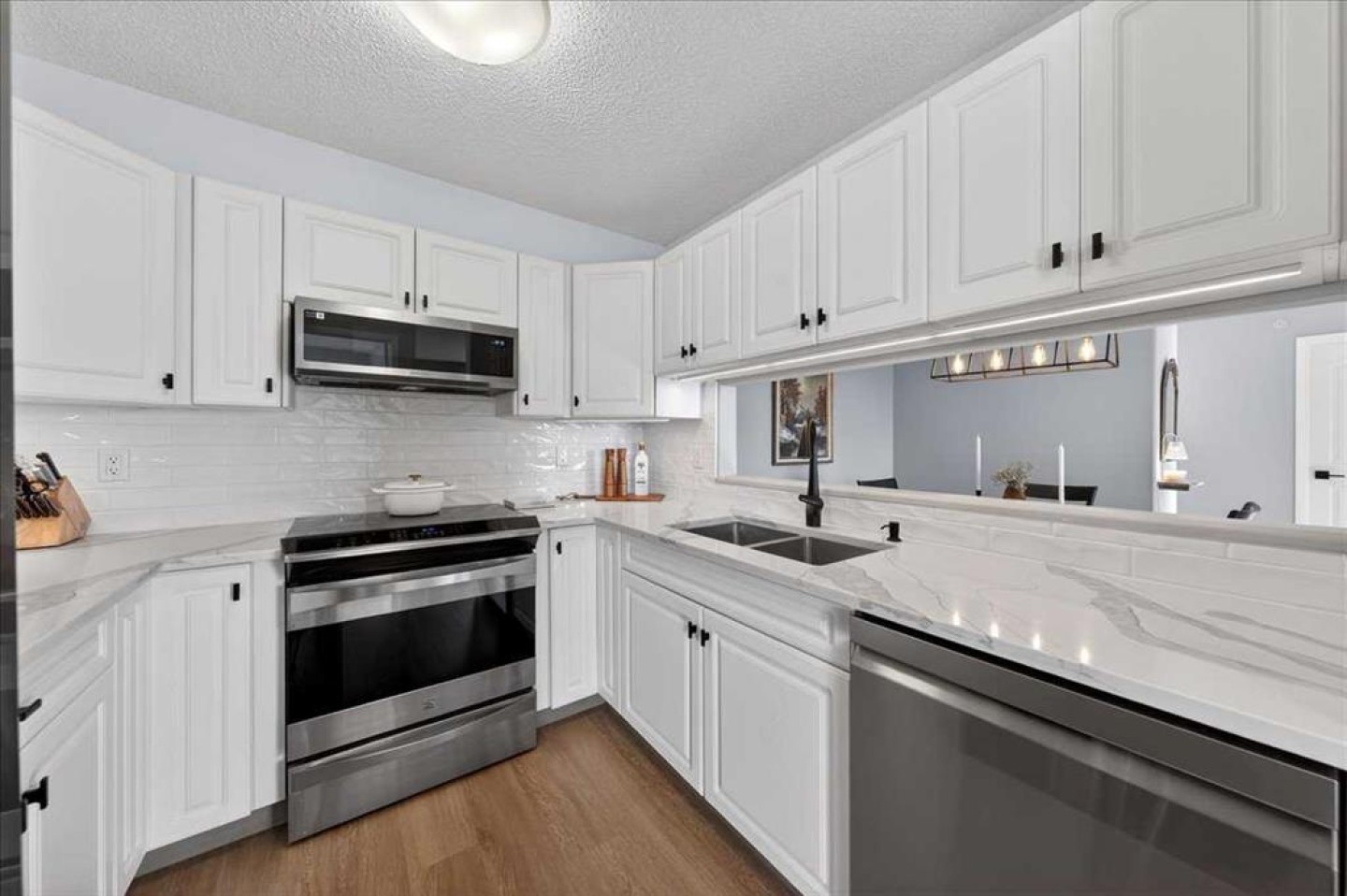 The kitchen is where this home truly shines. Tastefully updated with new appliances, refreshed hardware, and a clean, modern aesthetic, it offers generous prep space and storage while giving you those luxurious vibes. It’s functional, polished, and designed for real life — whether that’s weeknight dinners or a quiet Sunday morning coffee with mountain views in the background.