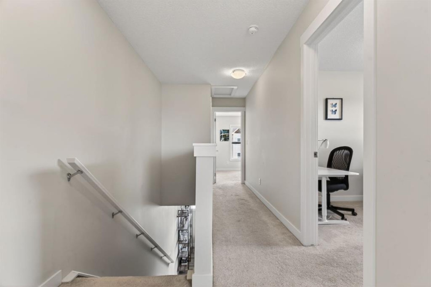 Welcome to this beautifully appointed corner end-unit townhouse in the sought-after community of Nolan Hill, offering 1,427.61 sq ft of thoughtfully designed living space, stunning city views, and exceptional natural light throughout. Perfectly positioned in the heart of the complex, this home enjoys a quieter interior location while still being just minutes from everyday amenities including Costco, T&T Supermarket, shopping, restaurants, and quick access routes in and out of the city. The main level features a bright and open-concept layout with expansive windows that flood the space with natural light. The stylish kitchen showcases white cabinetry, modern hardware, stainless steel appliances, quartz countertops, a sleek tile backsplash, and direct access to the private balcony — the perfect place to enjoy morning coffee while taking in the elevated city views. The kitchen flows seamlessly into the dining area and spacious living room, creating an ideal setup for both everyday living and entertaining. Upstairs, you’ll find three generous bedrooms including a stunning primary retreat with large windows and beautiful views. The additional bedrooms are well-sized and ideal for guests or family. The home also features a tandem double attached garage, offering secure parking for two vehicles plus additional storage — a rare and valuable feature in townhouse living. With its corner positioning, extra windows, quiet interior location, functional layout, and incredible convenience to major amenities, this Nolan Hill townhouse delivers the perfect balance of comfort, style, and accessibility.