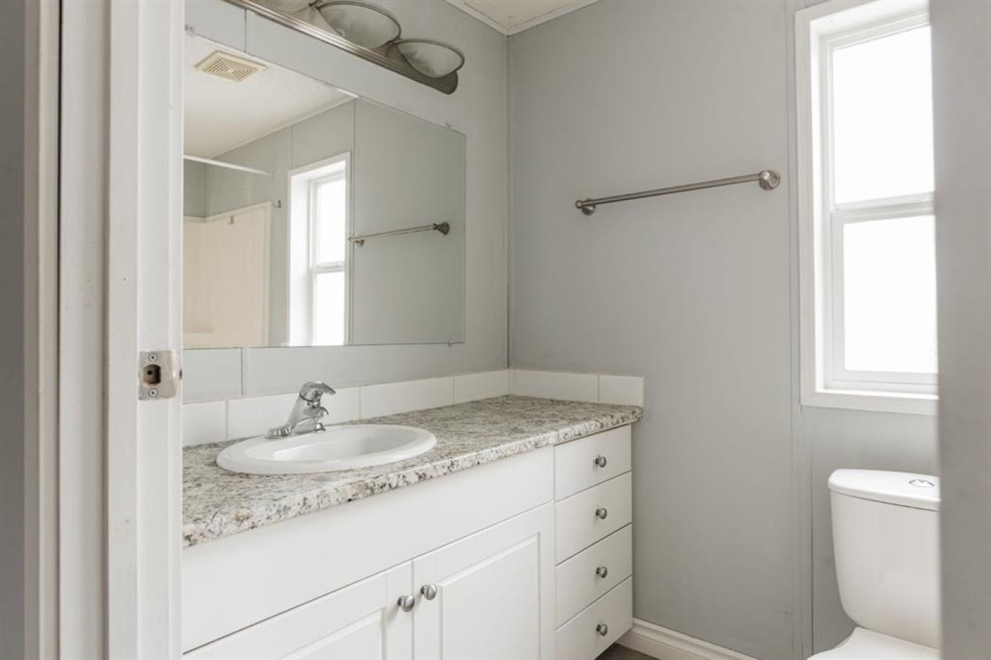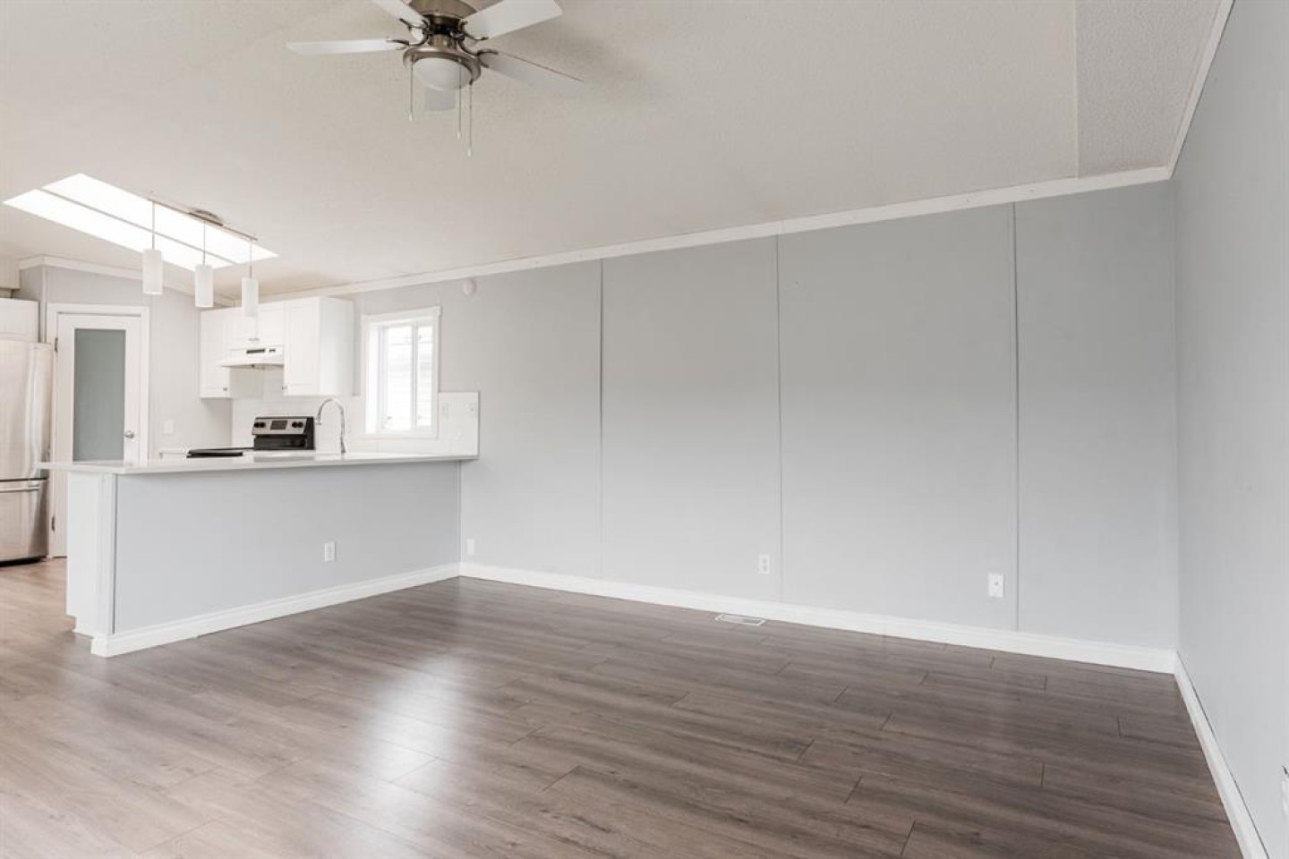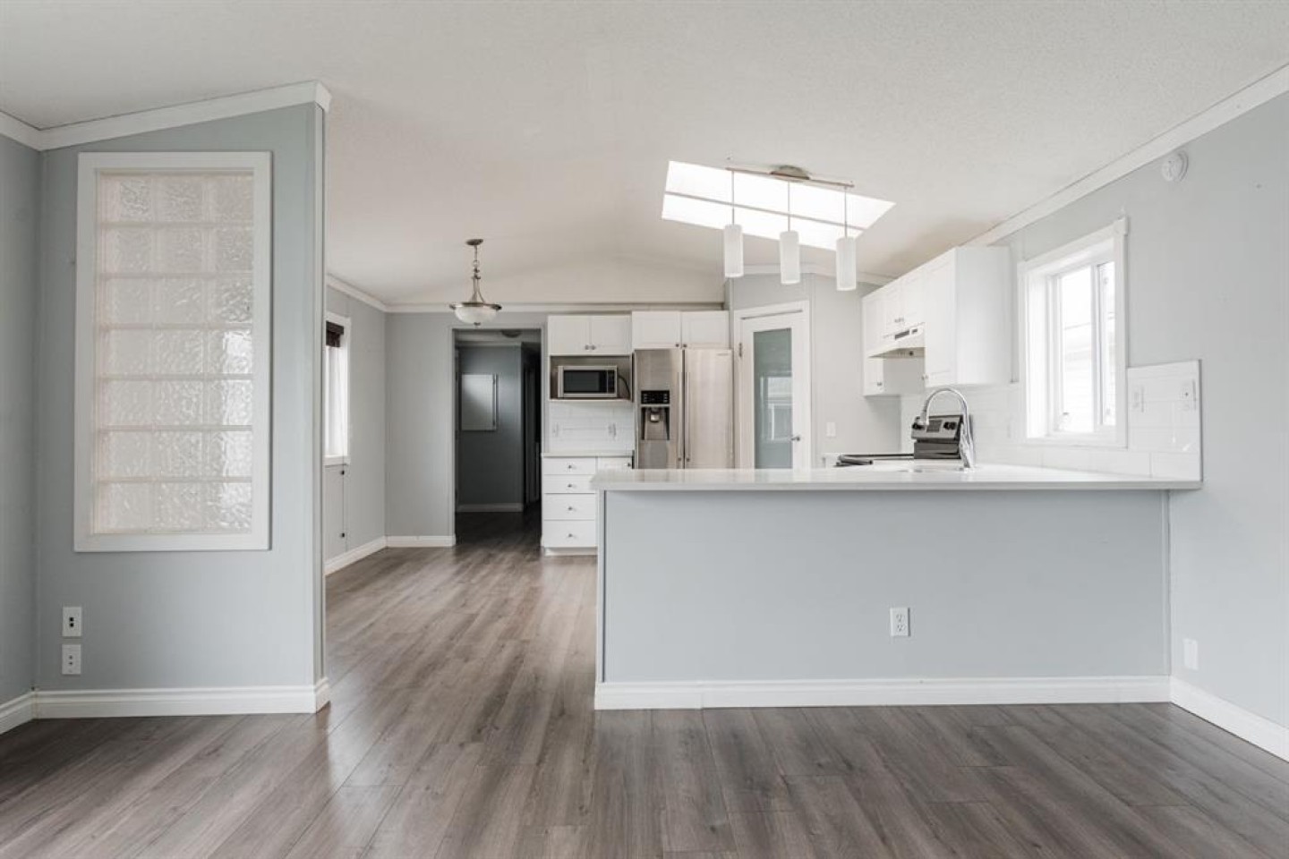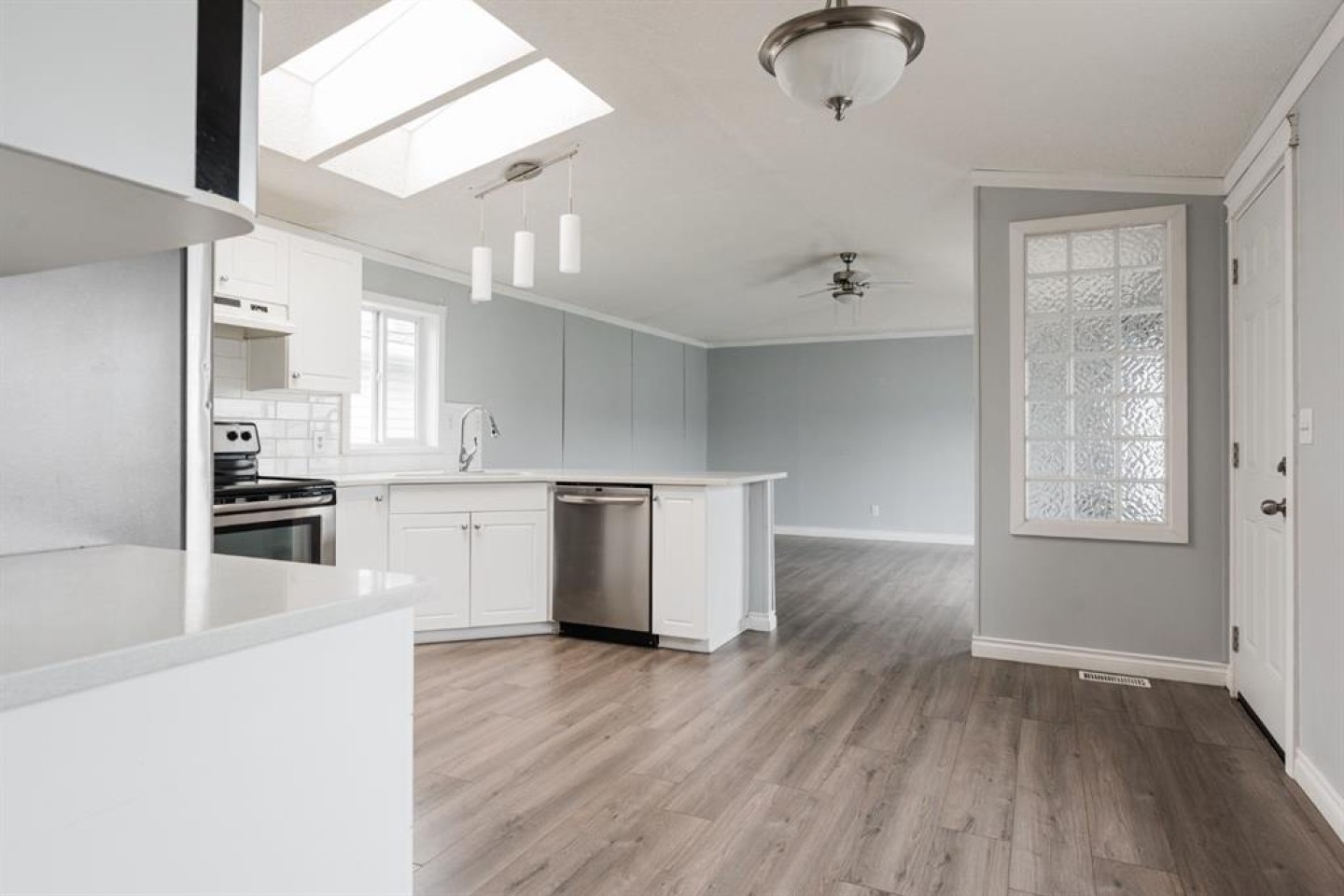 The open-concept living room is spacious and filled with natural light, featuring stylish grey walls that enhance the modern aesthetic. Down the hall, you'll find the primary bedroom, complete with a large walk-in closet and a full four piece ensuite bathroom. On the opposite end of the home are two additional bedrooms, including one oversized room with two windows and two closets, providing ample space and versatility. A second four piece bathroom is conveniently located between these bedrooms, and both bathrooms feature matching white vanities that complement the kitchen cabinetry.