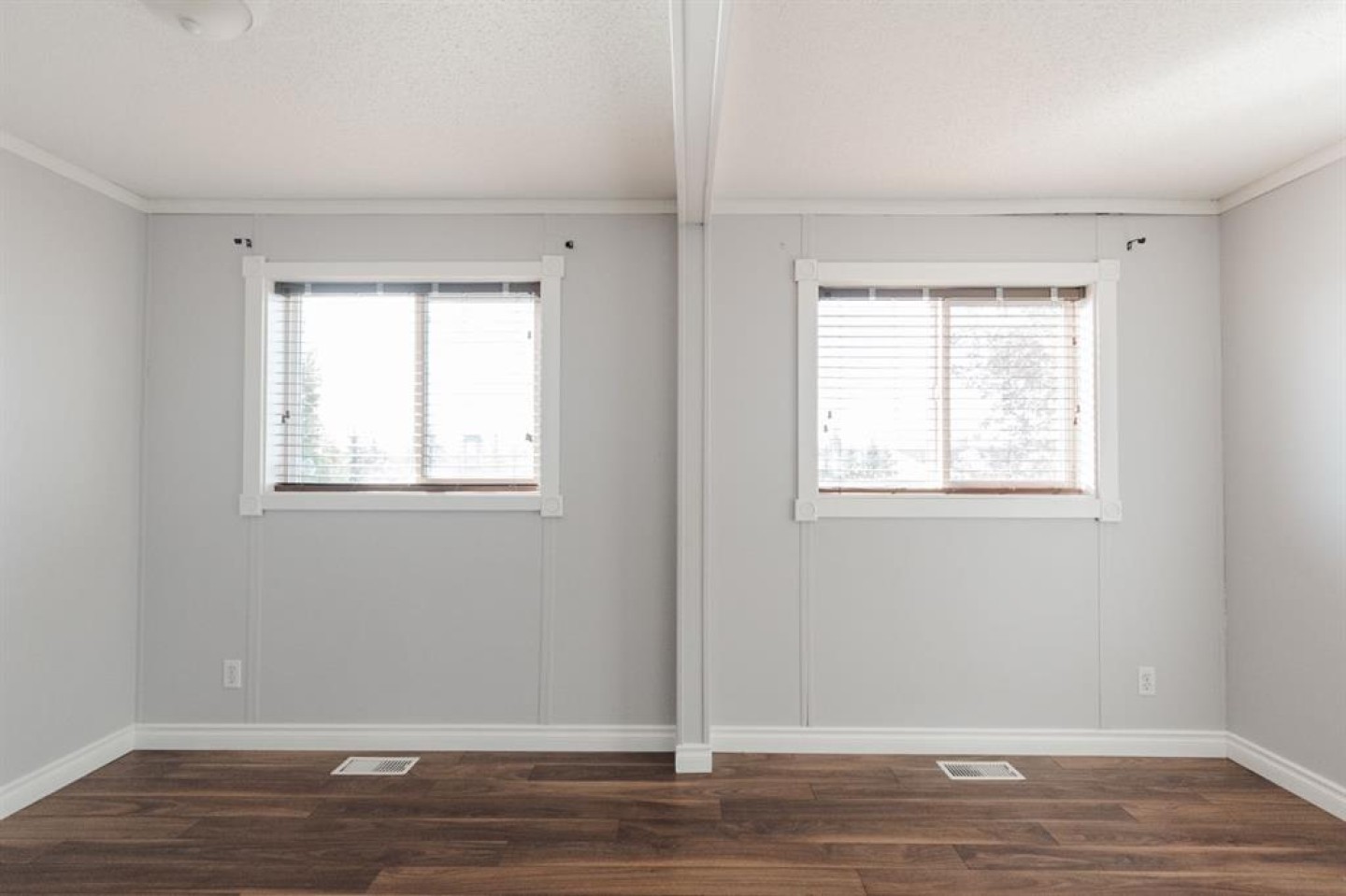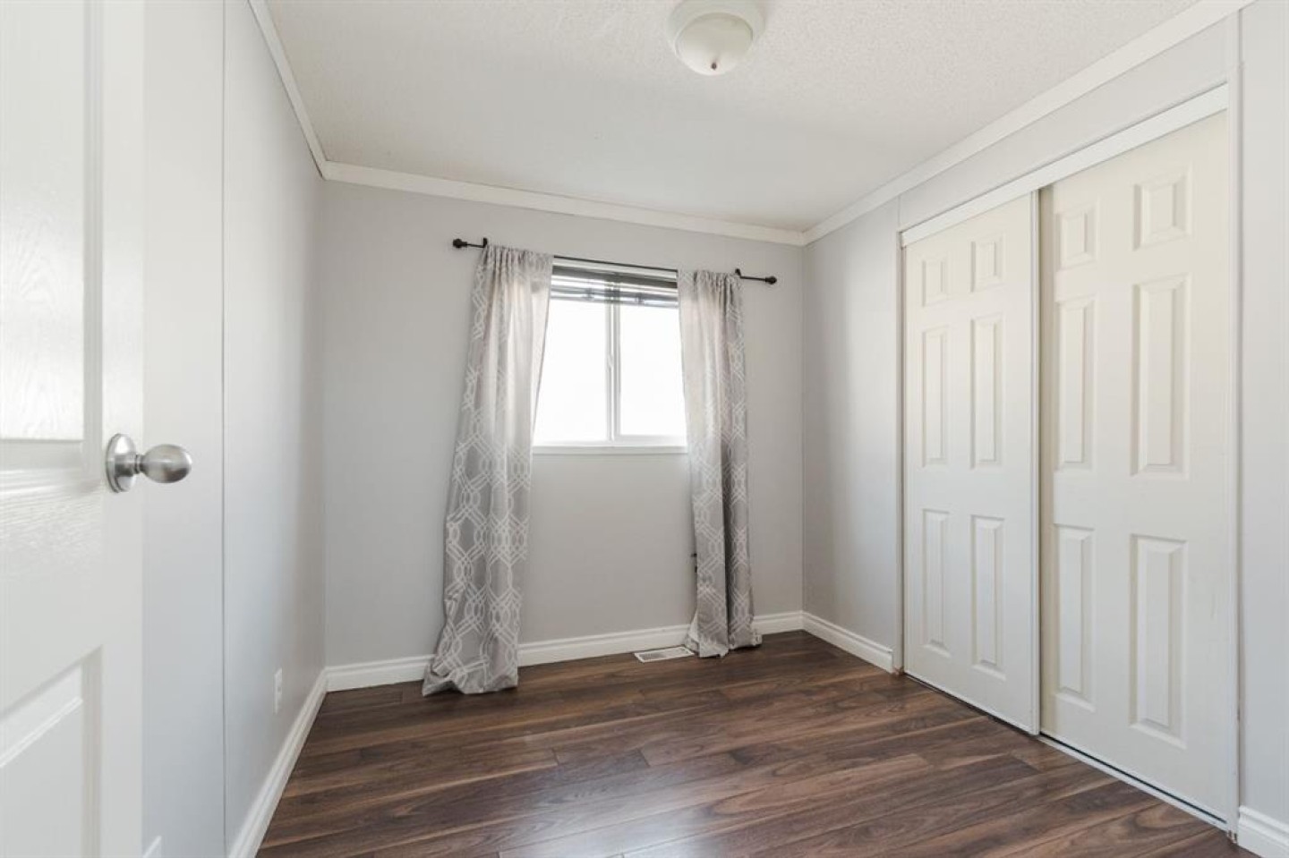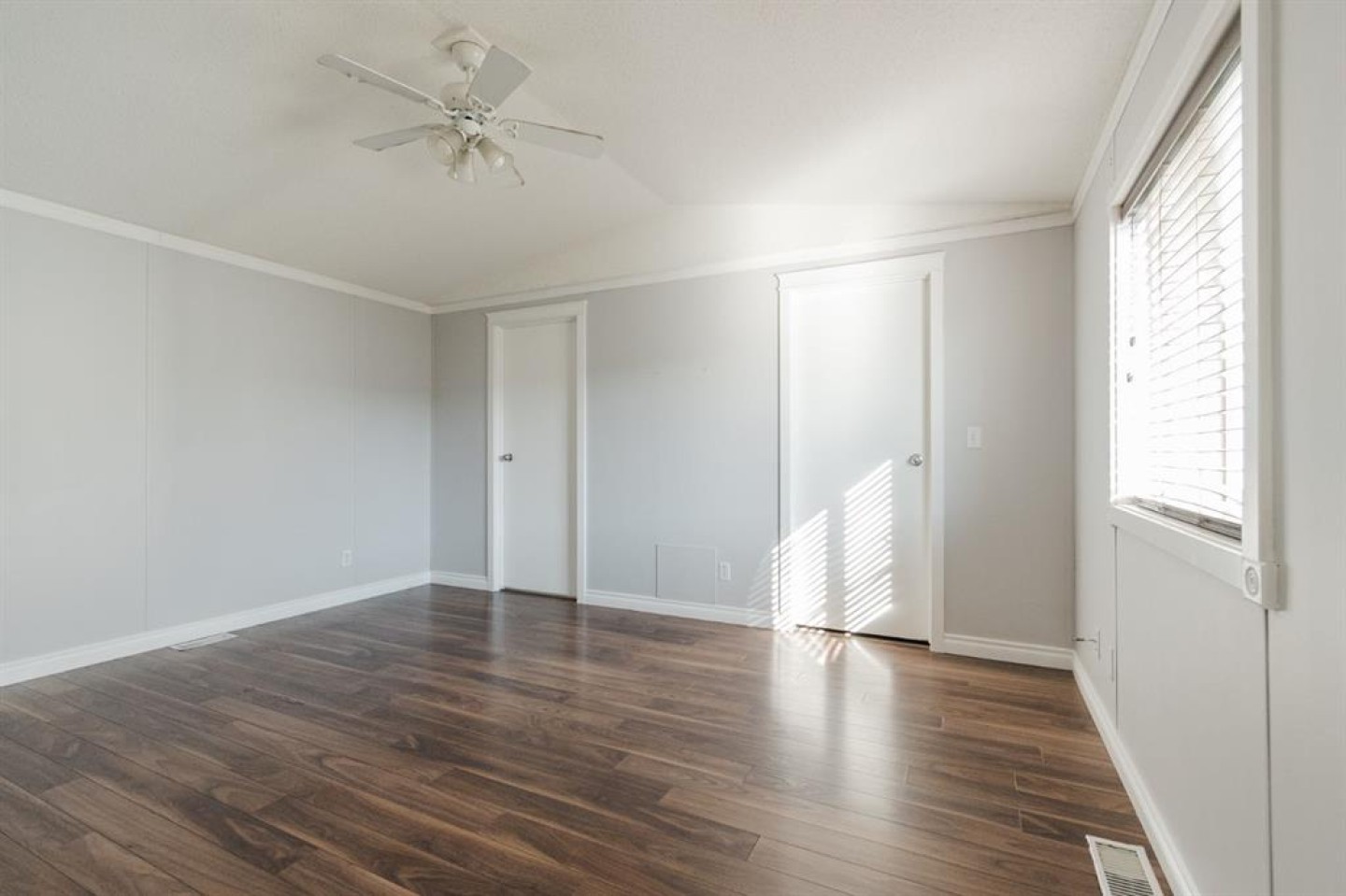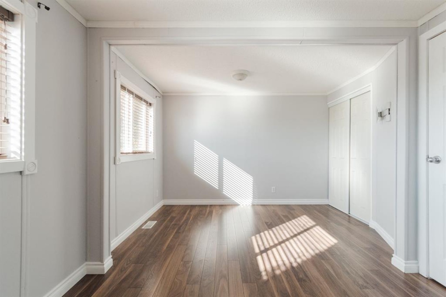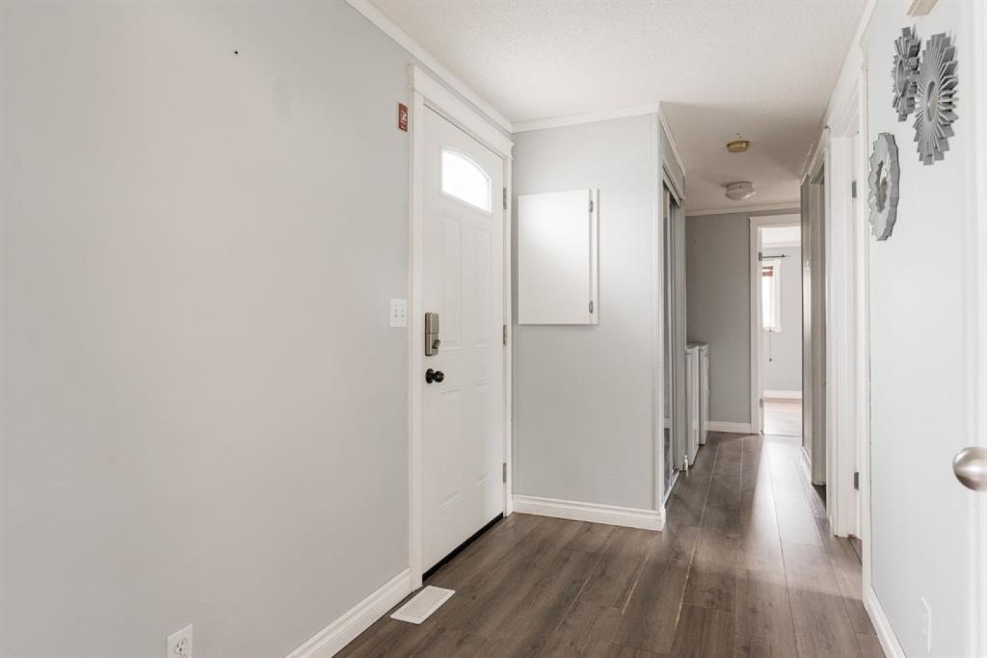 The open-concept living room is spacious and filled with natural light, featuring stylish grey walls that enhance the modern aesthetic. Down the hall, you'll find the primary bedroom, complete with a large walk-in closet and a full four piece ensuite bathroom. On the opposite end of the home are two additional bedrooms, including one oversized room with two windows and two closets, providing ample space and versatility. A second four piece bathroom is conveniently located between these bedrooms, and both bathrooms feature matching white vanities that complement the kitchen cabinetry.