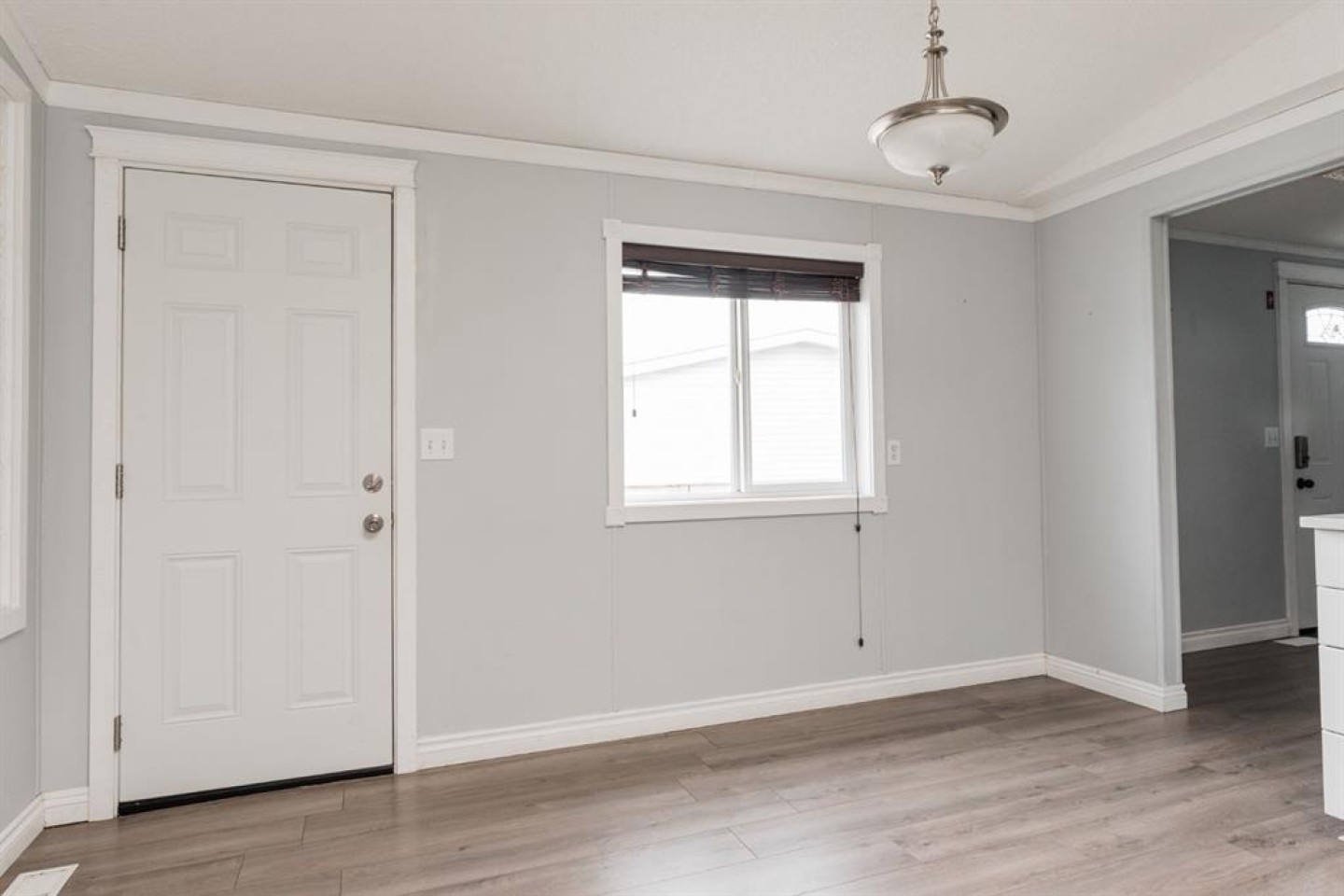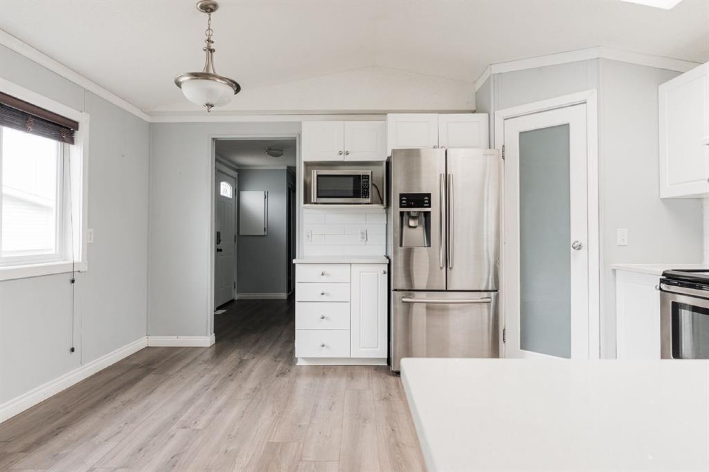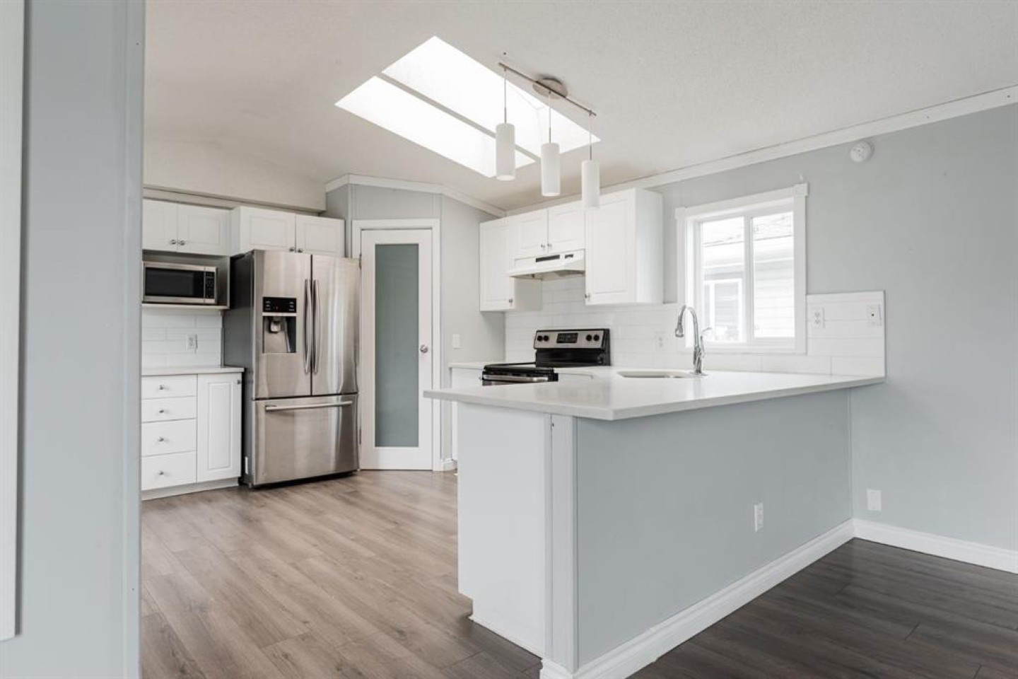 Gorgeous wide plank flooring flows seamlessly throughout the entire home, complementing the bright and airy kitchen. The kitchen boasts white cabinets, new quartz countertops, a corner pantry, stainless steel appliances, subway tile backsplash, and a long eat-up peninsula, perfect for entertaining and casual dining. With two exterior doors—one just off the dining area—you’ll enjoy easy access to your yard and deck, ideal for outdoor relaxation.