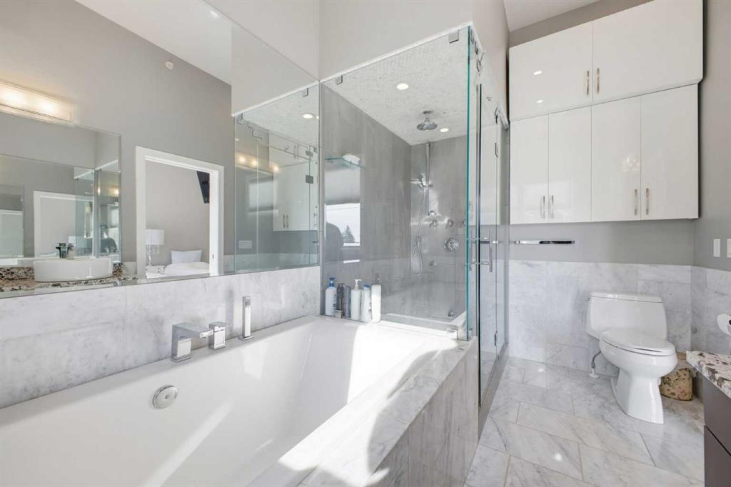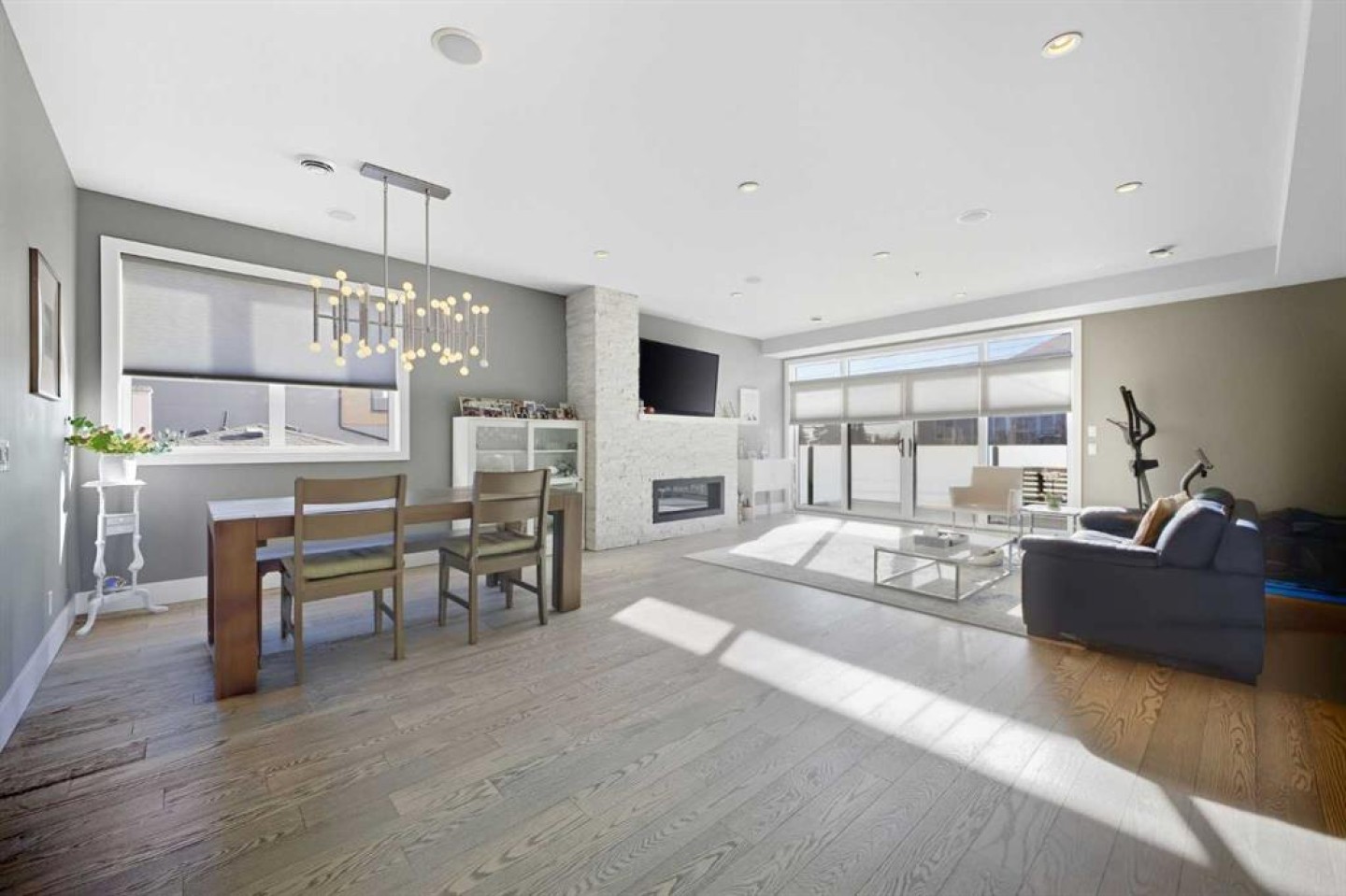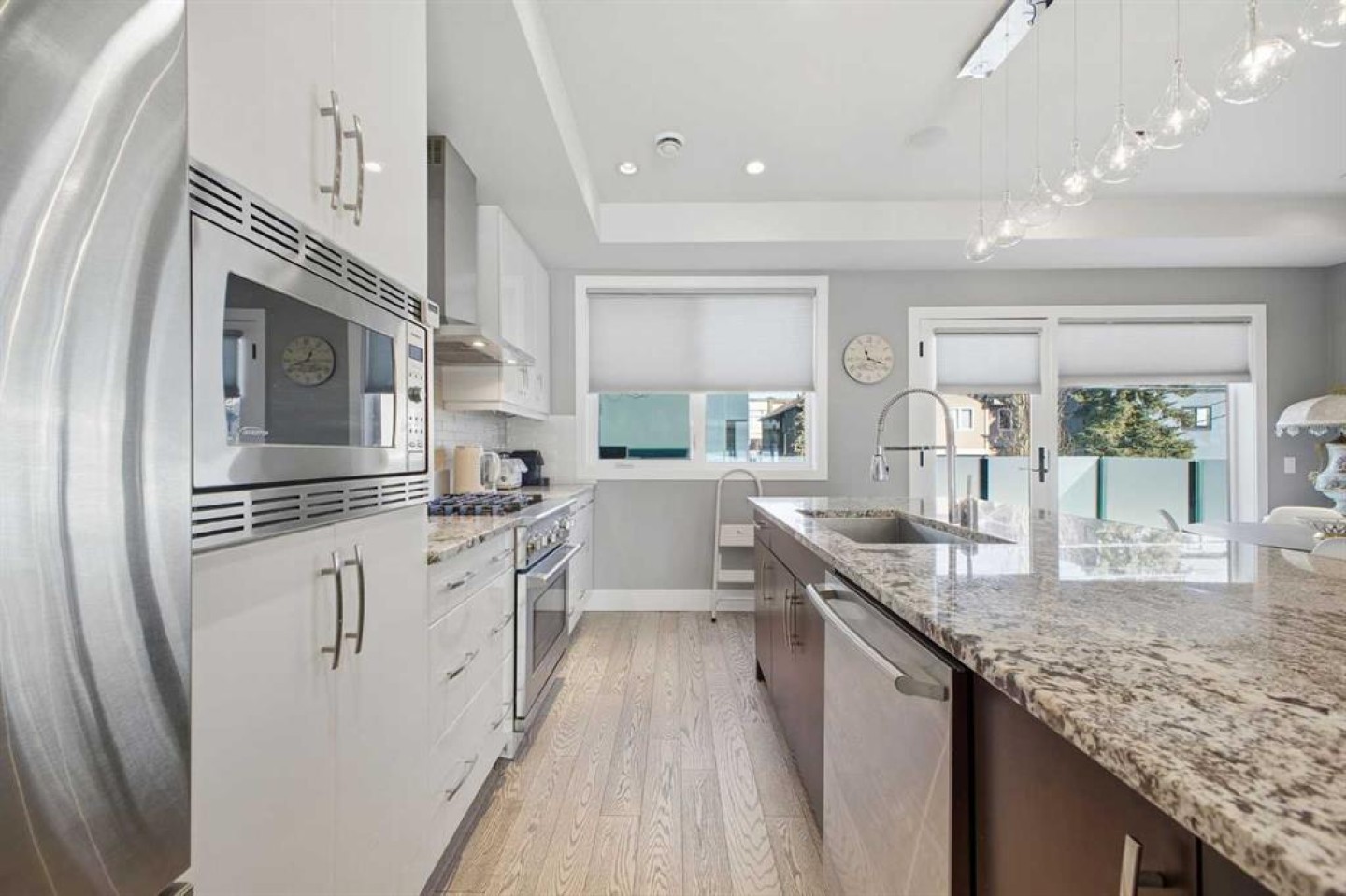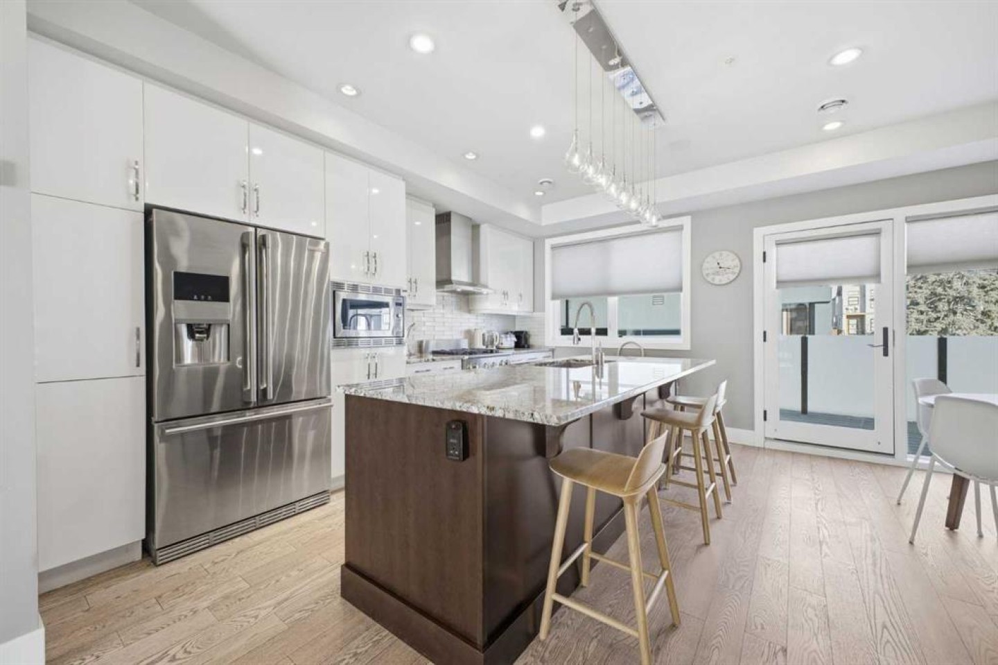 Gorgeous upscale 3 bedroom townhome in the heart of South Calgary offering over 2100 sq ft of living space & an ELEVATOR SERVING ALL 3 LEVELS! The open & airy main level presents wide plank hardwood floors, lofty ceilings & is drenched in natural light, showcasing the spacious living room that’s anchored by a feature fireplace & has access to a private deck with outdoor fireplace. The dining area with stylish light fixture provides ample space to host family & friends & seamlessly flows into the kitchen that’s tastefully finished with granite counter tops, island/eating bar, plenty of storage space, stainless steel appliances & cozy breakfast nook with access to the north balcony with BBQ gas hookup. A 2 piece powder room completes the main level. The second level hosts 3 bedrooms plus 4 piece main bath & laundry facilities. The generously sized primary retreat with private balcony boasts a walk-in closet & luxurious 5 piece ensuite with marble flooring, dual sinks, relaxing soaker tub & rejuvenating steam shower. Other notable features include an elevator, central air conditioning, built-in speakers & single attached garage. The prime location is incredibly convenient, walking distance to vibrant Marda Loop, River Park, Marda Loop CA, schools, shopping, public transit & effortless access to 14th Street & Crowchild Trail.