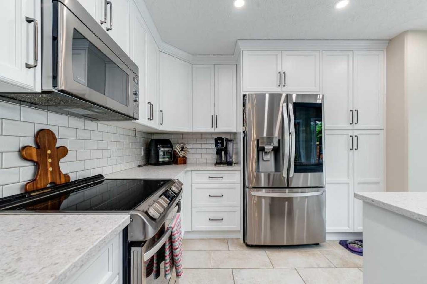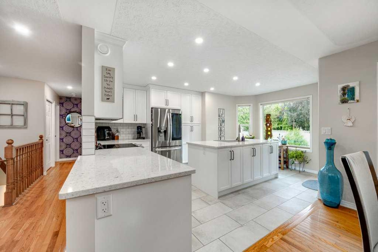 This 1,386 sq ft bungalow has been extensively updated and meticulously maintained, offering true move-in ready perfection that shows a solid 10 out of 10. The heart of the home is the bright and spacious new kitchen, featuring white shaker cabinets, a large island, quartz countertops, newer appliances, and an open design ideal for cooking and entertaining. The main floor boasts three generously sized bedrooms, including a primary suite with an updated 3-piece ensuite. The front bedroom, with its large windows overlooking the yard, is perfect for a home office or den. A warm and inviting living room showcases gleaming hardwood floors and a cozy fireplace, while an updated 4-piece bathroom and a separate laundry room add everyday convenience. The fully developed basement expands the living space with a huge family/games room, an additional bedroom, a 4-piece bathroom, a gym area, an office, and abundant storage—all enhanced by the comfort of underfloor heating. Outdoors, the beautifully landscaped backyard offers a deck, large ground-level patio, garden boxes, mature trees, and vinyl fencing for low maintenance and privacy. A double attached garage completes this exceptional property. Situated on a quiet cul-de-sac near schools and shopping, this home is the perfect blend of style, comfort, and functionality for any family. A bonus is the underground sprinklers for easy lawn care.