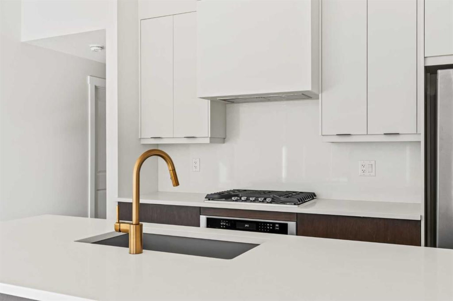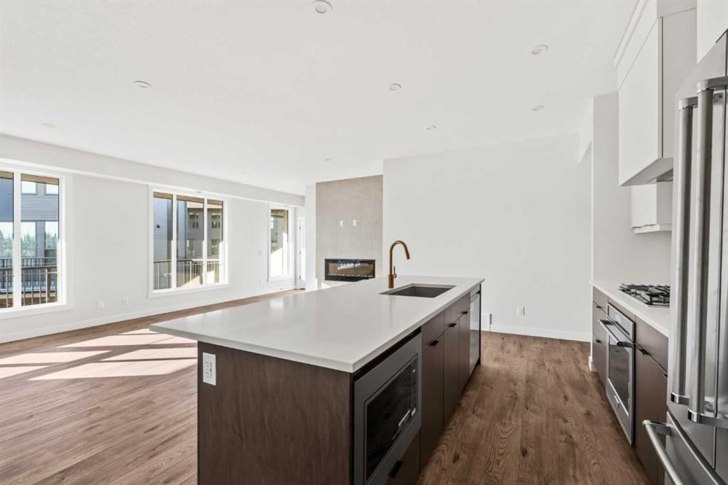 The Hyde at Crown Park offers true single-level living without compromise and represents one of the final opportunities to own a brand-new bungalow-style townhome in this highly sought-after community. Featuring 3 bedrooms, 2 bathrooms, and nearly 1,400 sq.ft. on one level, plus a private double attached garage and exceptional storage, this home is perfectly suited for those looking to downsize while keeping the space and functionality they’re accustomed to. Ideally positioned in the heart of Crown Park, the residence features a southwest-facing balcony overlooking the central park and is located just minutes from downtown Calgary - combining maintenance-free living with an inner-city lifestyle. The main living space is beautifully designed for everyday comfort and effortless entertaining. A timeless white kitchen anchors the home, opening seamlessly to the living and dining areas while a full wall of southwest-facing windows fills the space with natural light. The kitchen showcases quartz countertops, a warm wood accent island, and a premium built-in appliance package including a gas cooktop and built-in oven. The expansive living room features a striking floor-to-ceiling tiled fireplace and comfortably accommodates gatherings with ample seating space for 6+ people, while the generous dining area easily hosts a table for eight - perfect for family dinners and entertaining. Privately positioned at one end of the home, the primary retreat is thoughtfully separated from the secondary bedrooms by the laundry area, enhancing privacy. The suite includes a large walk-in closet and a spa-inspired ensuite with dual vanities and a walk-in shower with 10mm glass surround. Two additional bedrooms offer flexible use as guest space, a home office, or media room and are served by a full bathroom. A spacious laundry room with additional cabinetry and folding counter adds everyday convenience. Outdoor living is equally impressive with an approximately 26’ x 8’ covered southwest-facing balcony overlooking the park and complete with a gas line, hose bib, and A/C rough-in - maximizing sunlight year-round both inside and out! The lower level provides access to the oversized private double attached garage along with two large storage areas, offering the extra space rarely found in bungalow-style living. Located within Calgary’s newest inner-city community, this brand-new home delivers a true lock-and-leave lifestyle and includes full builder warranty plus Alberta New Home Warranty. Rarely do single-level townhomes with private double garages become available - this is your chance to secure a low-maintenance bungalow lifestyle without sacrificing space, location, or comfort. This brand new opportunity is one of the very last opportunities available at his exceptional master-planned inner-city development - don't wait!