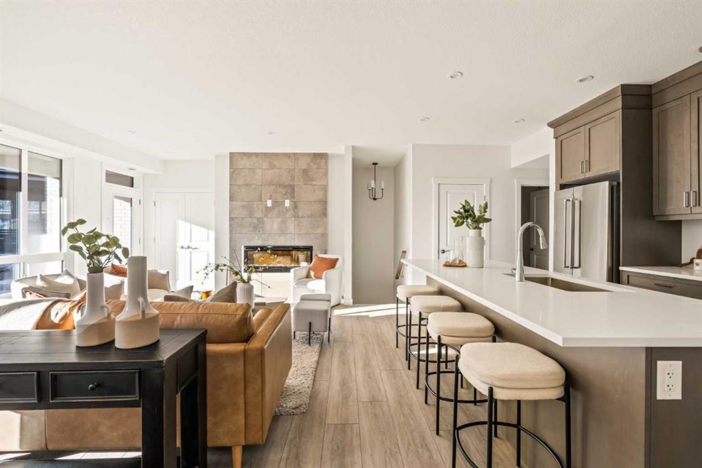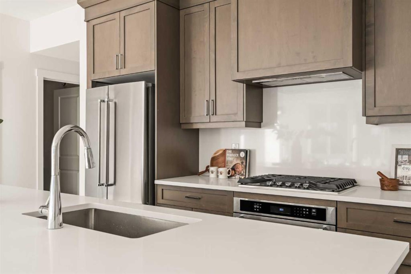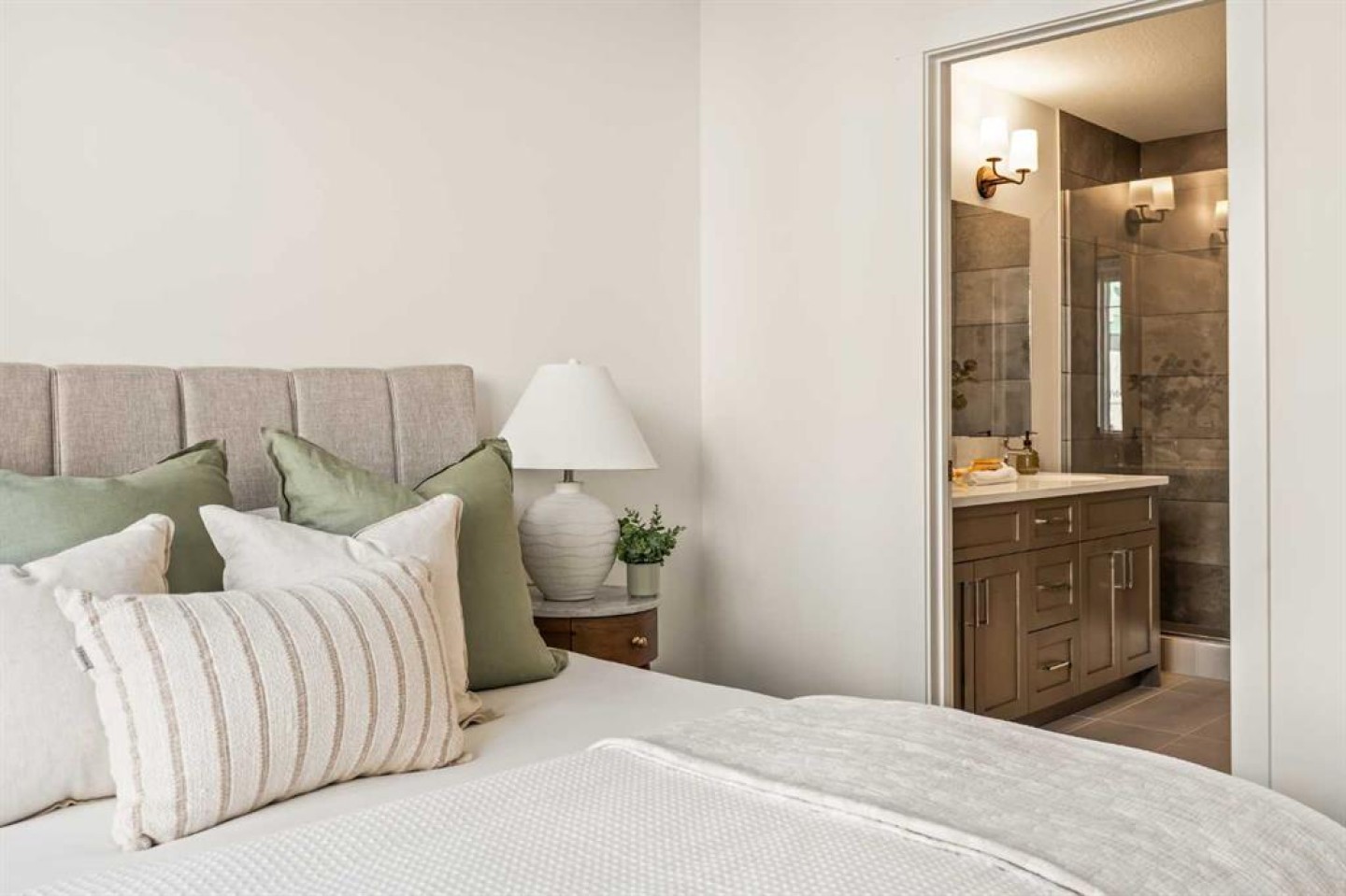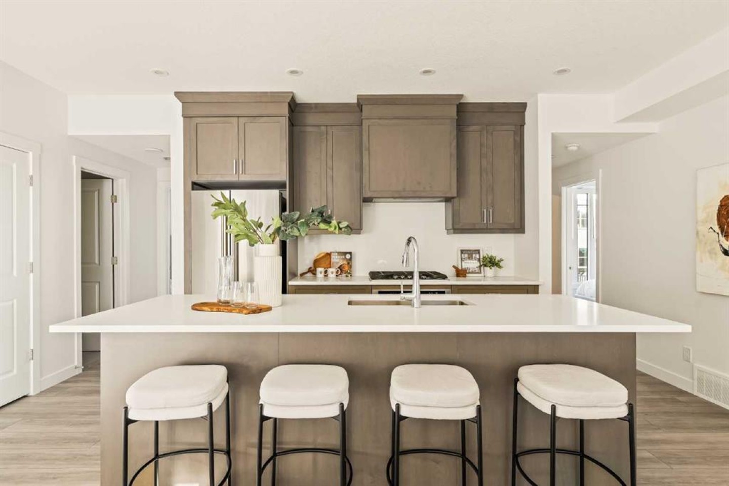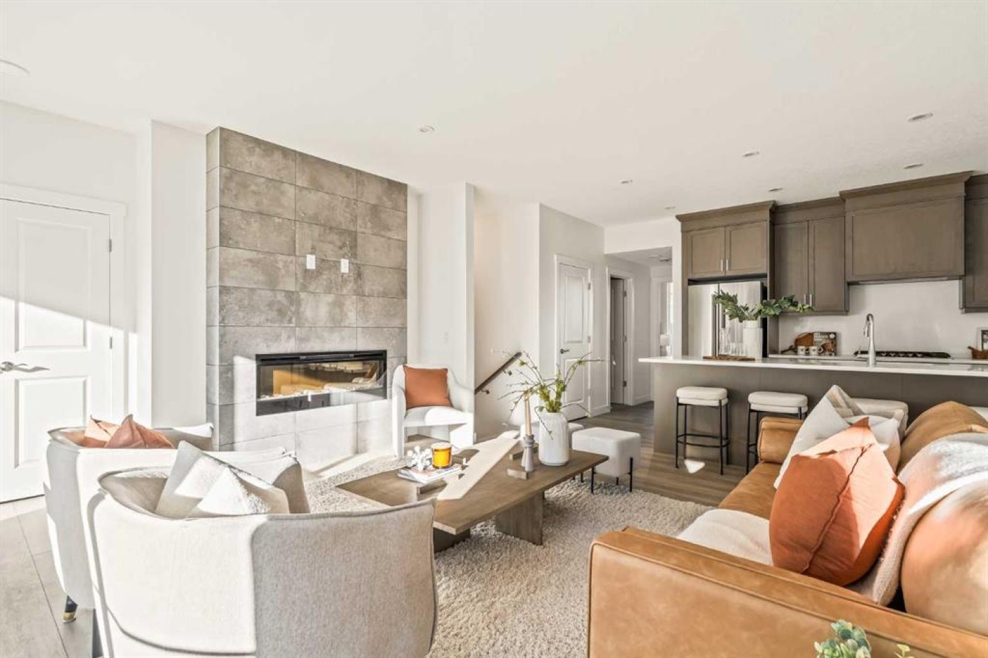 Welcome to the Regent at Crown Park, a beautifully crafted bungalow-style townhome offering true single-level living without compromise! This unique design combines the benefits of a bungalow lifestyle without compromising on storage or garage space, all while moving into a brand new beautiful home with full warranty! Thoughtfully designed with down-sizers in mind, this maintenance-free residence is perfect for those who travel or simply prefer a lock-and-leave lifestyle free from exterior upkeep, landscaping, or snow removal. This brand-new 3-bedroom, 2-bathroom home offers nearly 1,300 sq.ft. of well-planned living space on one level, plus a lower level featuring extensive storage and access to the oversized double garage. At the heart of the home, a stunning open-concept living area was created for effortless entertaining. The central kitchen seamlessly connects the living and dining spaces while a full wall of south-west facing windows floods the interior with natural light all year long. Timeless finishes include warm-tone natural wood shaker maple cabinetry, light quartz countertops, and a premium built-in appliance package featuring a gas cooktop, built-in oven, and chimney hood fan - ensuring the chef is always part of the conversation. A striking floor-to-ceiling tile fireplace anchors the great room, offering a warm focal point and comfortable seating for gatherings. The spacious dining area easily accommodates a full table and buffet, providing exceptional furnishing flexibility. Privately positioned at the rear of the home, the primary retreat features a generous walk-in closet and spa-inspired ensuite with dual vanities and a tiled walk-in shower with 10mm glass. A centrally located laundry room with upper cabinetry and folding counter enhances everyday convenience while naturally separating the primary suite from the secondary bedrooms. Two additional bedrooms and a full bathroom provide versatility for guests, a home office, media room, or creative space - while maintaining excellent resale appeal. The lower level offers a large storage room and an oversized utility room (approx. 17' x 7') ideal for hobbies or seasonal storage. A double closet and oversized double attached garage completes the interior features on the lower level. Step outside to your private covered southwest-facing patio spanning over 26 feet that overlooks the park and includes a gas line, hose bib, and A/C rough-in - the perfect setting for relaxed outdoor living and future upgrades in mind. Bungalow-style townhomes with double attached garages are exceptionally rare. Enjoy added peace of mind with comprehensive builder warranty coverage plus Alberta New Home Warranty. Located minutes from downtown and surrounded by established amenities, Crown Park offers the confidence of a mature community paired with the comfort of a brand-new home. This is one of the very last brand new opportunities remaining - a truly rare opportunity you won’t want to miss!