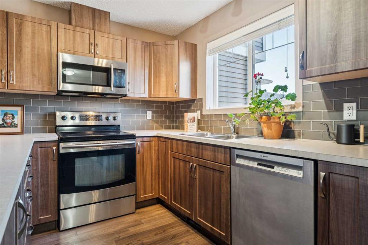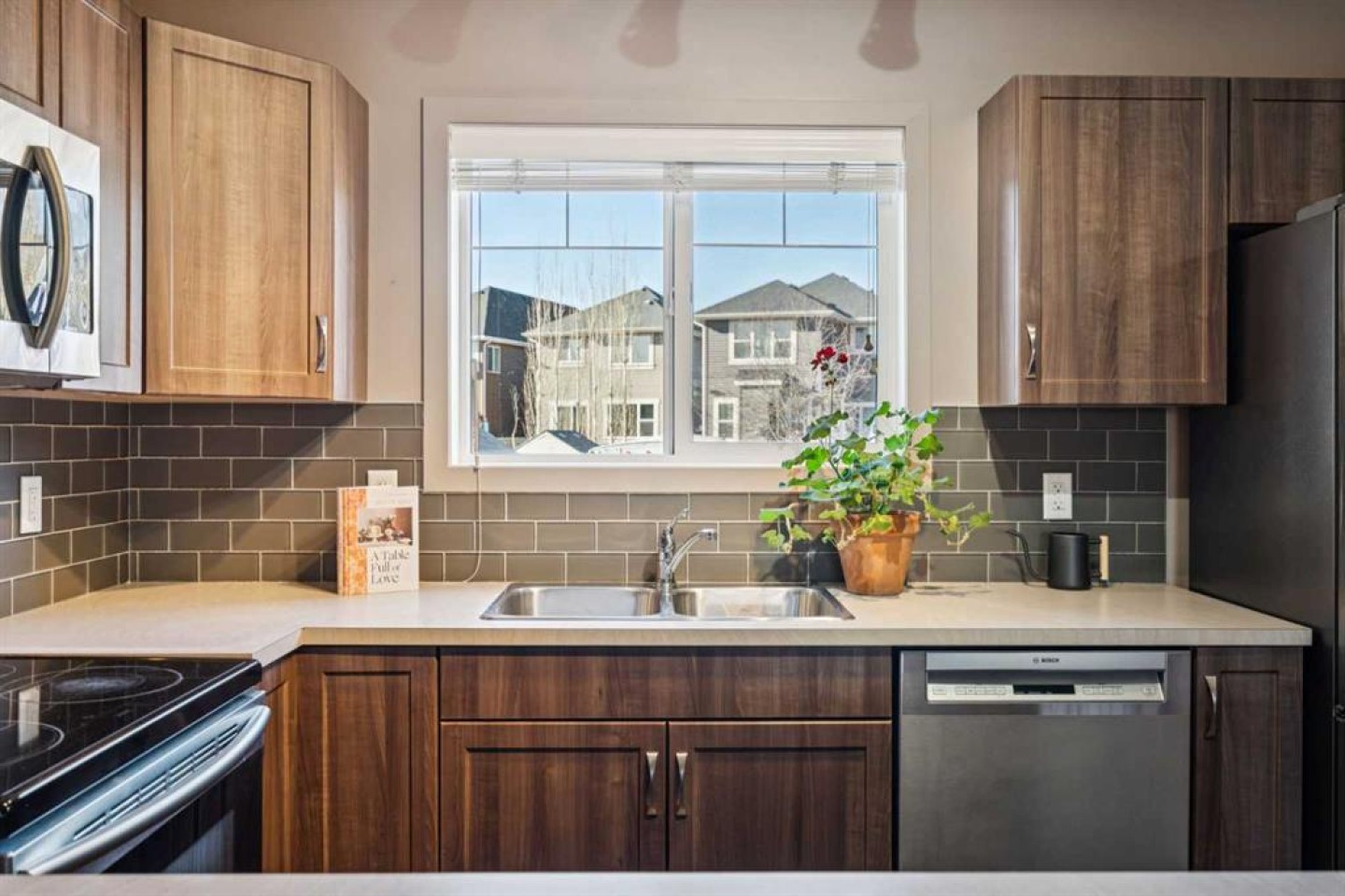 Dishwasher, Dryer, Electric Stove, Range Hood, Refrigerator, Washer, Window Coverings