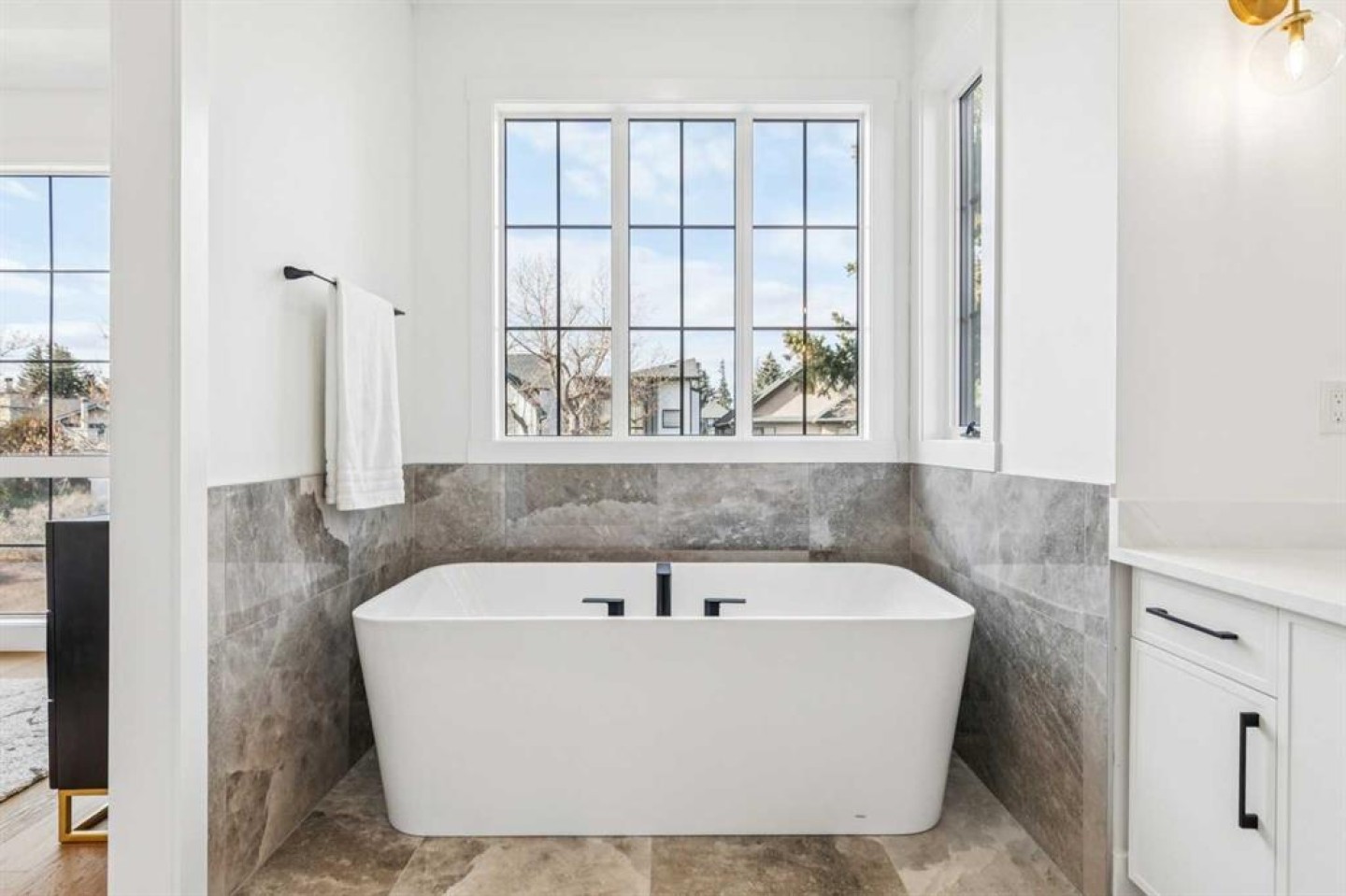 Upstairs, the primary retreat offers an airy feel with a vaulted ceiling, walk-in closet, and a spa-like ensuite showcasing statement flooring, dual vanities, and a beautiful freestanding tub. Two additional bedrooms, a modern main bathroom, and an upper-floor laundry room provide comfort and convenience for the whole household.