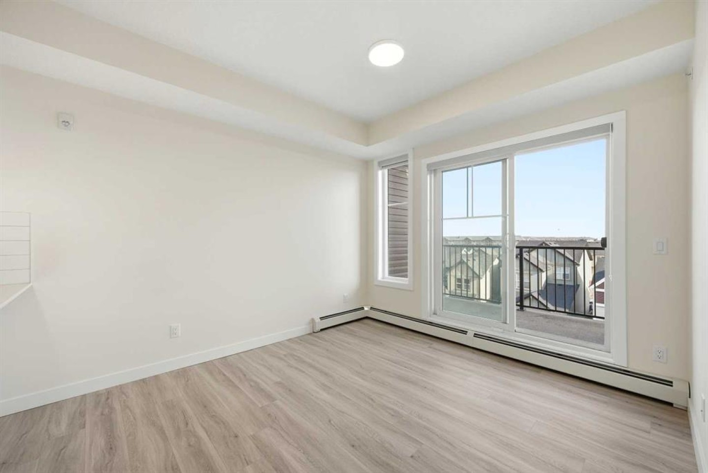 TOP FLOOR/CORNER UNIT/ BEAUTIFUL VIEWS FROM UNIT/2 BEDROOM/1 BATH/BALCONY. Discover modern living in this brand-new, never-occupied 2-bedroom, 1-bathroom condominium in the highly desirable community of Skyview Ranch NE Calgary Offering 656 of living space (Included Balcony) & immediate possession, this beautifully finished unit combines style, functionality, and convenience in one exceptional package. Key location features- WALKING DISTANCE TO SCHOOL, SHOPPING, PARK & more. Step inside to find a bright and airy open layout enhanced by 9-foot ceilings and oversized windows that allow natural light to pour in. The contemporary design is highlighted by wide-plank luxury vinyl flooring and elegant quartz surfaces throughout, creating a clean and upscale aesthetic. The kitchen is thoughtfully upgraded with stainless steel appliances, quartz countertops, soft-close cabinets, a generous PANTRY, and a convenient BREAKFAST ISLAND perfect for dining, meal prep, or casual entertaining. The kitchen flows effortlessly into the dining and living areas, providing a comfortable and welcoming space for both daily living and hosting guests. Two well-sized bedrooms offer flexibility for a home office, guest room, or roommate setup. The stylish 4-piece bathroom features modern finishes and quartz counters for a polished look. Additional features include in-suite laundry and upgraded window coverings for added comfort and privacy. Enjoy outdoor relaxation on the spacious private balcony complete with a gas line for BBQs—ideal for summer evenings. This unit also includes TITLED UNDERGROUND PARKING, a titled storage locker, and secure bike storage for added convenience. Located in a newly built complex, this property offers low-maintenance living close to shopping, schools, transit, major roadways including Stoney Trail, and Calgary International AIRPORT. Perfect for first-time buyers, young professionals, downsizers, or investors looking for a turnkey opportunity in a growing neighborhood. Move in right away or choose a flexible possession timeline to suit your needs. An excellent opportunity to own in one of Calgary’s most dynamic communities. Call your favorite realtor to book showings.