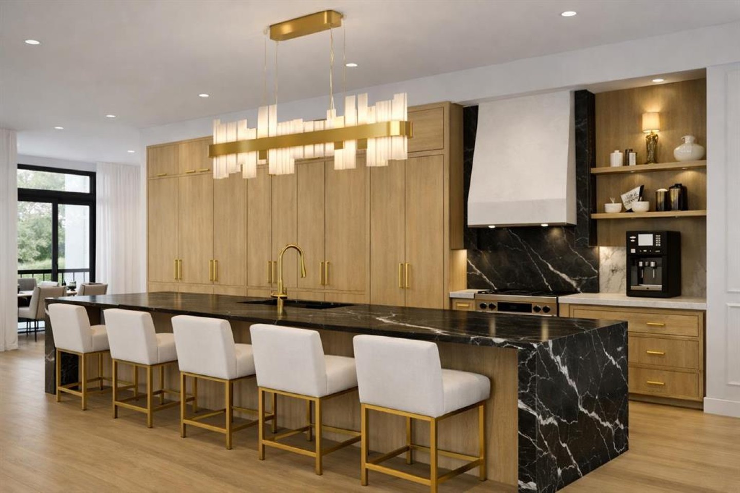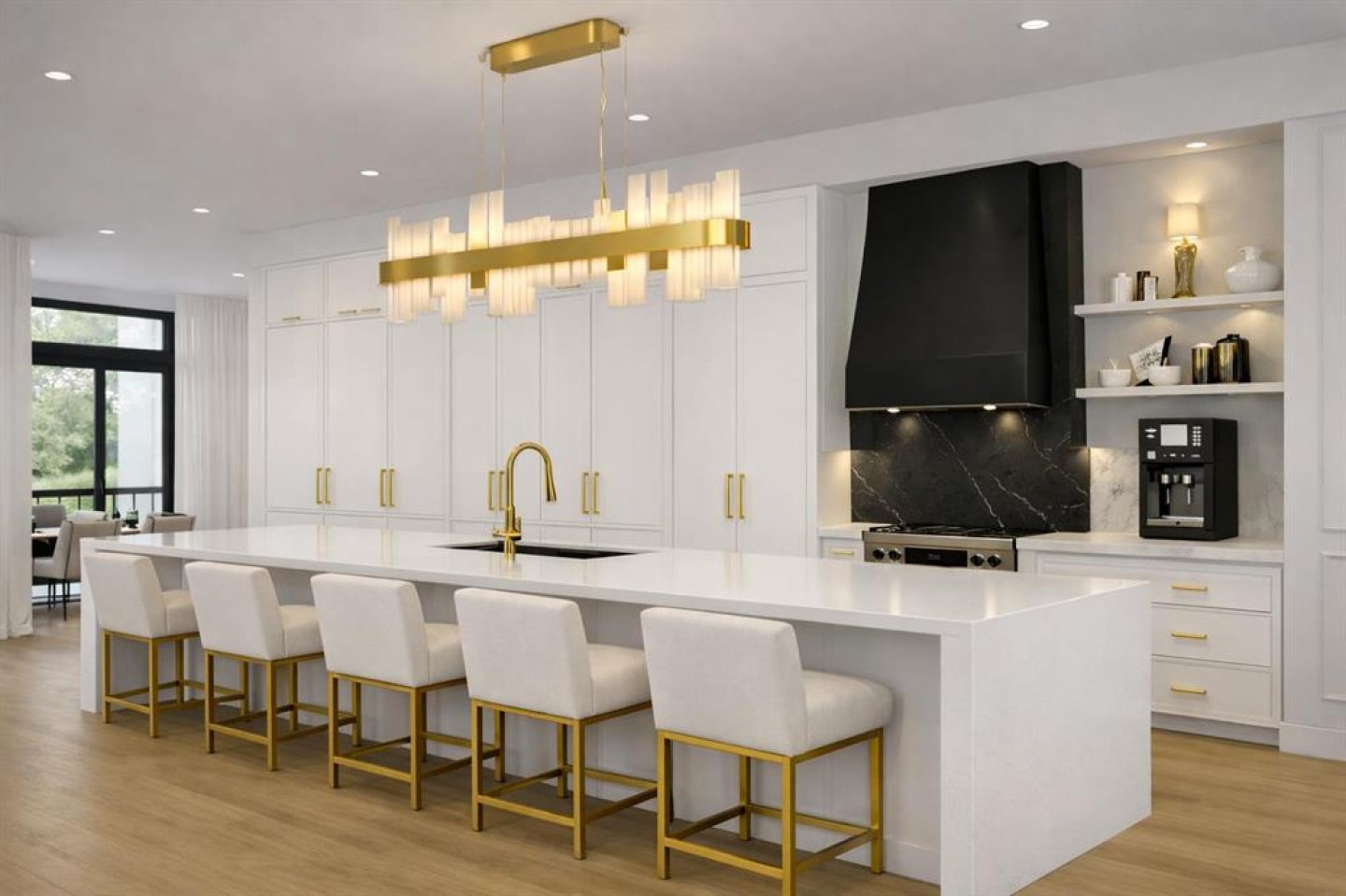 The bright main floor features 11-ft ceilings, wide plank hardwood floors, and a designer kitchen with a dramatic 14-ft waterfall island, quartz countertops, white oak shaker cabinetry, plaster hood fan, premium appliances, and modern gold/black accents. The spacious living room showcases a custom brick gas fireplace and built-ins, while the mudroom offers functional storage.