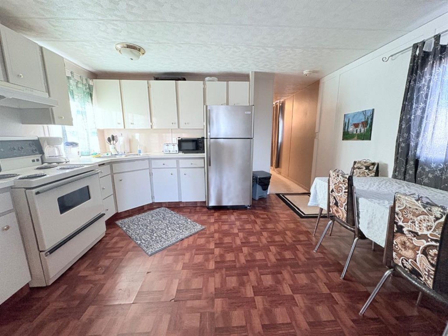 Built in 1976, the home features durable metal siding and a metal roof for low-maintenance ownership. Inside, you’ll find a bright living room with new vinyl-frame windows, a functional kitchen with shared dining area, and a comfortable, practical layout. Recent updates also include a new front door and a new 50-gallon hot water tank.