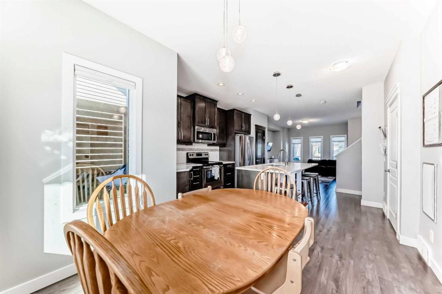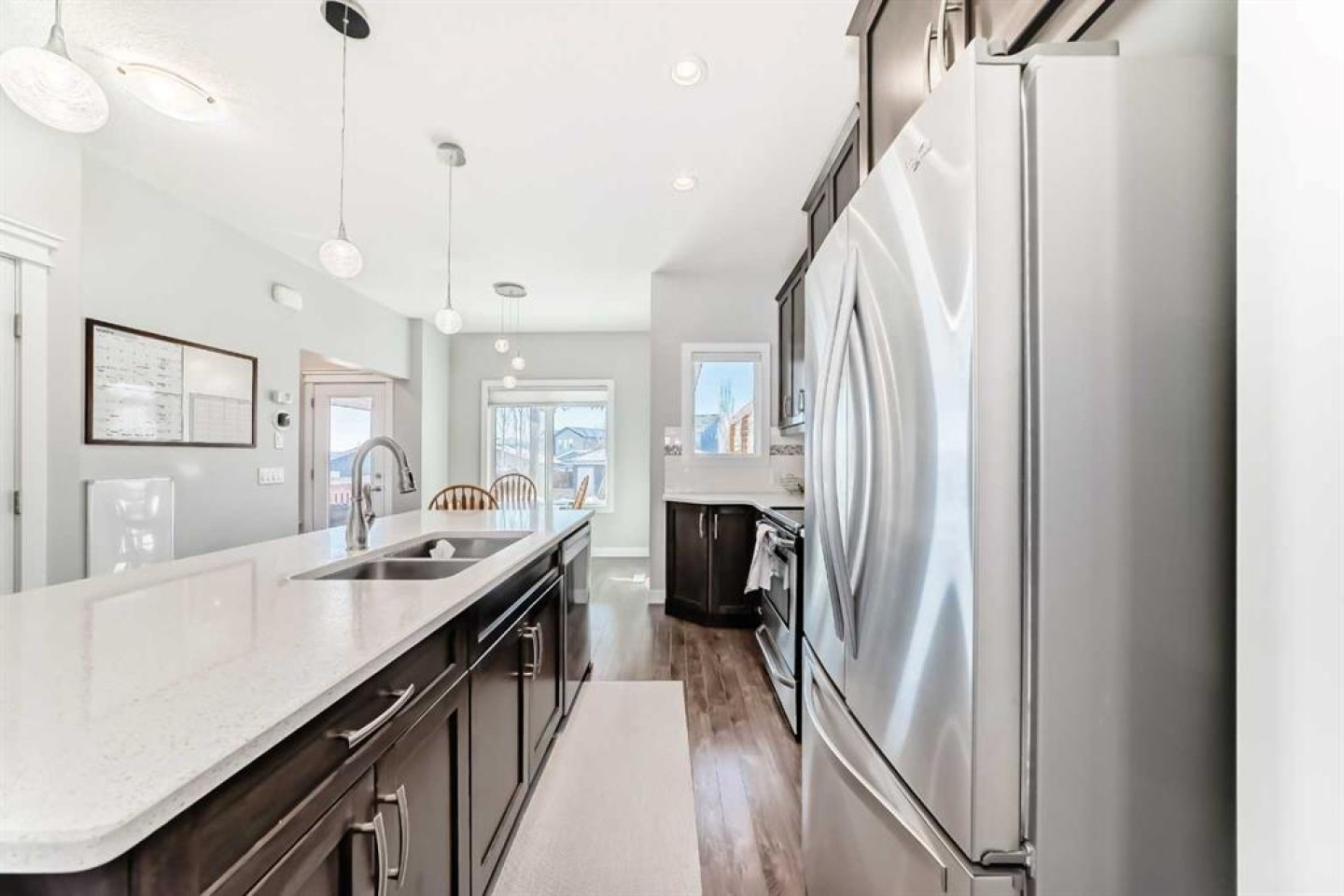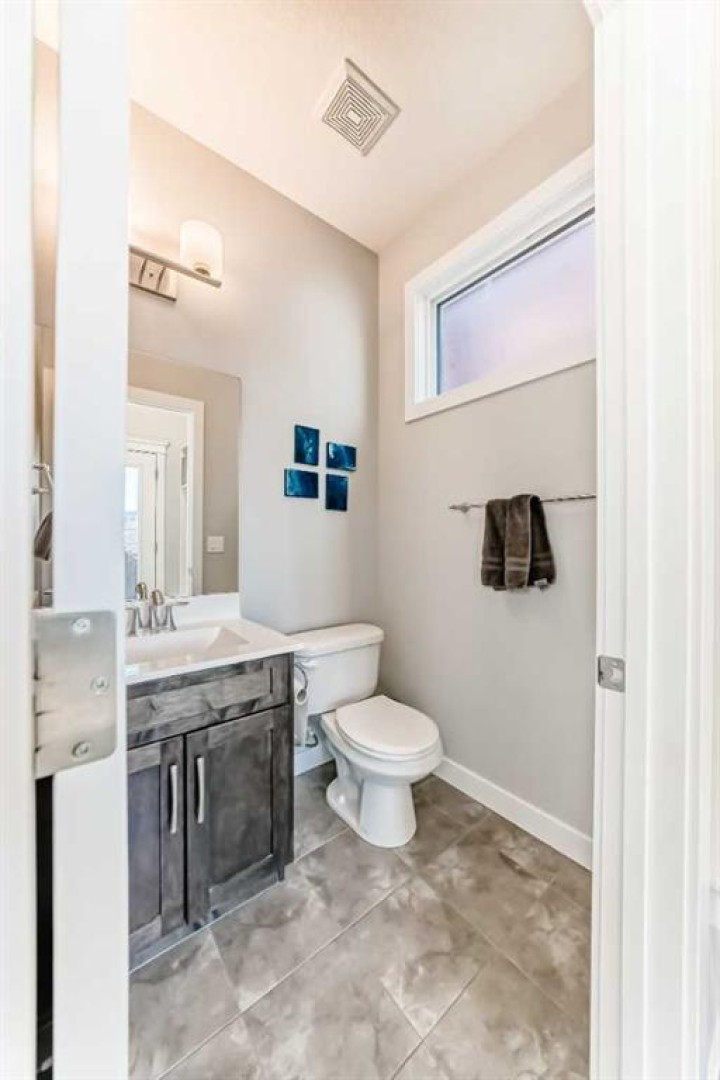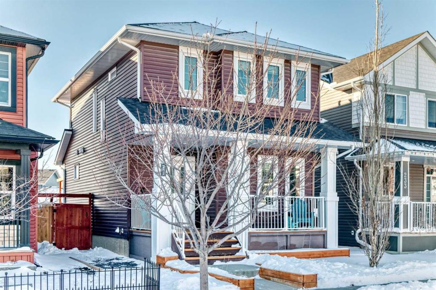 Perfect home for first time owners or a growing family, 2015 vintage 3+ bedroom 2 storey in Airdrie's district of Ravenswood. Lovely curb appeal with covered veranda. Upgraded wood laminate flooring on main floor with tiled front and rear entries. Large and spacious kitchen with 8 foot working island, separate pantry, 9 ft ceilings and tall cabinetry, dining room nook over looks rear yard, spacious great room expanding into flex space before kithen area, main floor laundry room with storage space. 3 Bedroom upstairs, 4 pce ensuite plus 4 pce for other bedrooms, All bedrooms have walk-in closets. Huge lot (142 ft+ long lot with sunny western exposure). Rear yard b. house and garage is about 65 ft long and 30 ft wide., lots of room for children or adults to play. Huge 16 ft X 18 ft wood deck with pergola, small decorative rocked side yards for low maintenance. Completely fenced lot. Basement fully dev'd with 9 foot ceilings, raised floors with laminate flooring, an office/bedroom, large recreation room, large storage room. High efficient furnace, A/C, over sized water heater for future teenagers. Oversized double garage 24 ft wide and 22 ft deep. Large lots are rare without backing onto busy locations.