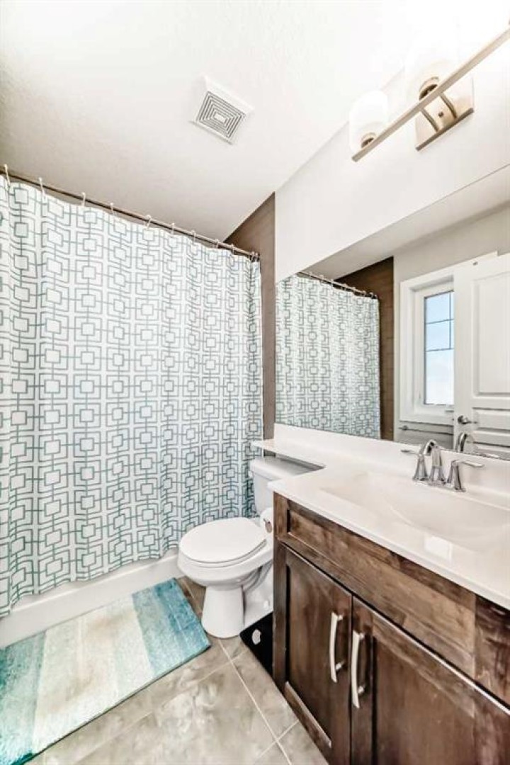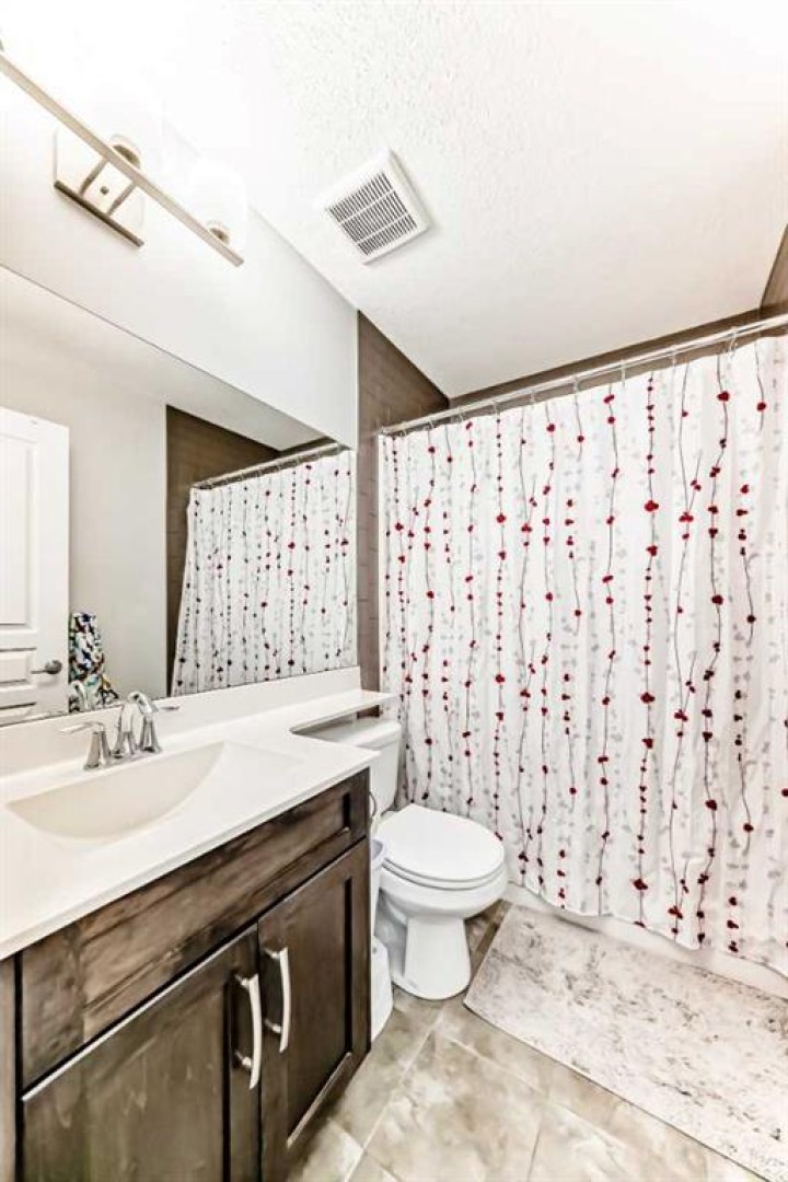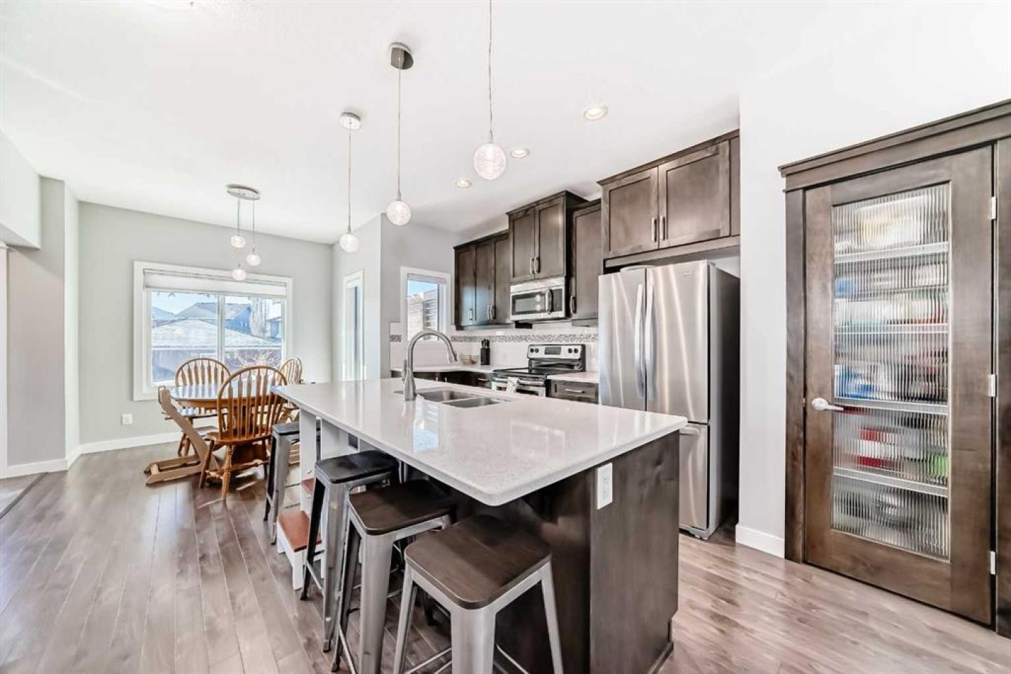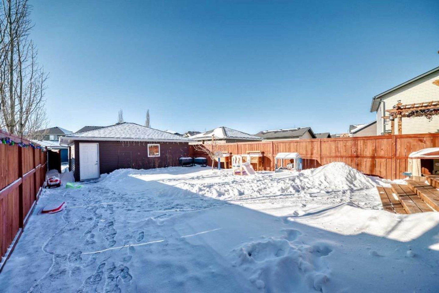 Perfect home for first time owners or a growing family, 2015 vintage 3+ bedroom 2 storey in Airdrie's district of Ravenswood. Lovely curb appeal with covered veranda. Upgraded wood laminate flooring on main floor with tiled front and rear entries. Large and spacious kitchen with 8 foot working island, separate pantry, 9 ft ceilings and tall cabinetry, dining room nook over looks rear yard, spacious great room expanding into flex space before kithen area, main floor laundry room with storage space. 3 Bedroom upstairs, 4 pce ensuite plus 4 pce for other bedrooms, All bedrooms have walk-in closets. Huge lot (142 ft+ long lot with sunny western exposure). Rear yard b. house and garage is about 65 ft long and 30 ft wide., lots of room for children or adults to play. Huge 16 ft X 18 ft wood deck with pergola, small decorative rocked side yards for low maintenance. Completely fenced lot. Basement fully dev'd with 9 foot ceilings, raised floors with laminate flooring, an office/bedroom, large recreation room, large storage room. High efficient furnace, A/C, over sized water heater for future teenagers. Oversized double garage 24 ft wide and 22 ft deep. Large lots are rare without backing onto busy locations.