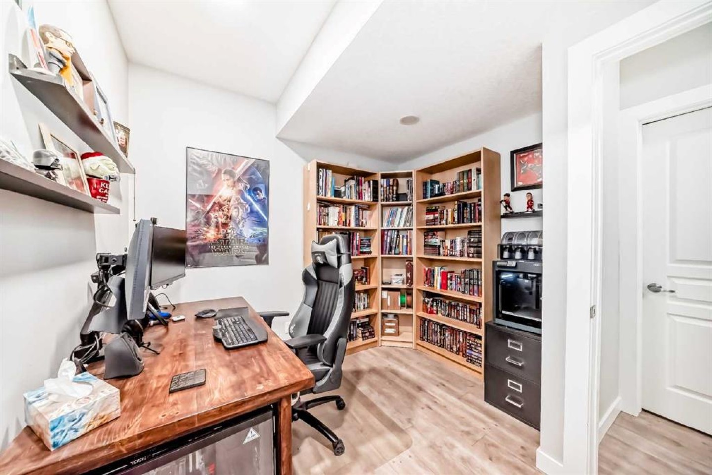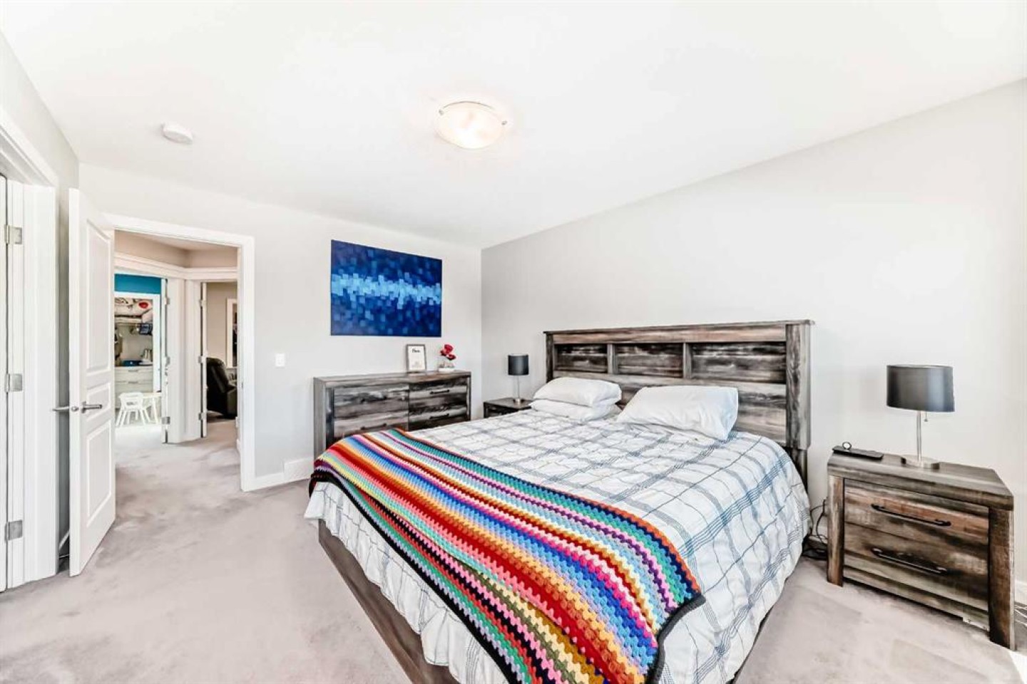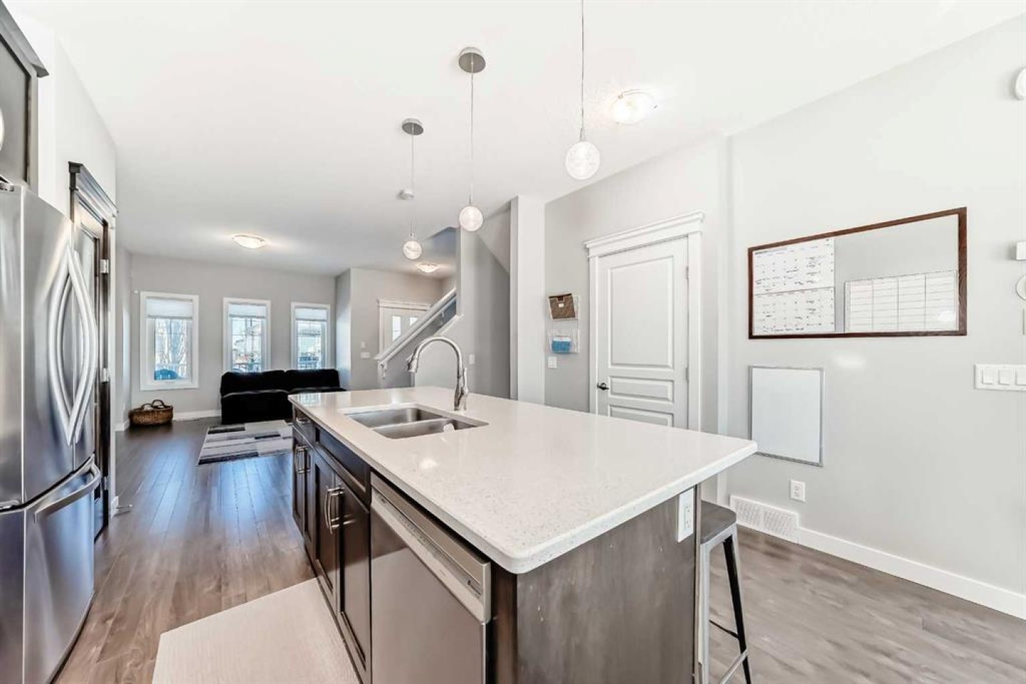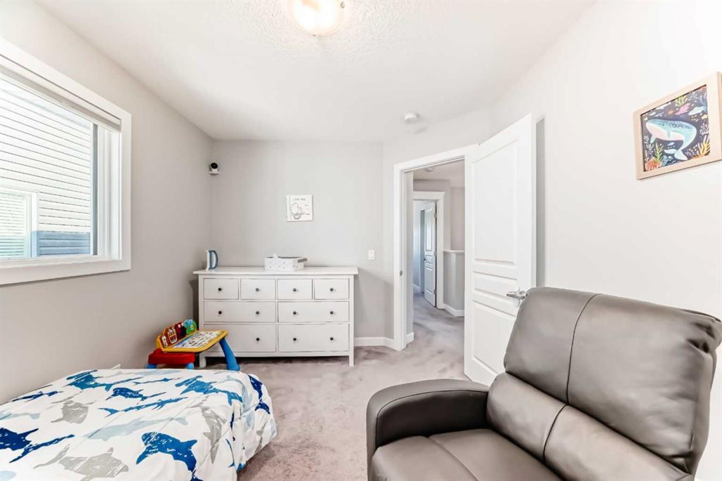 Perfect home for first time owners or a growing family, 2015 vintage 3+ bedroom 2 storey in Airdrie's district of Ravenswood. Lovely curb appeal with covered veranda. Upgraded wood laminate flooring on main floor with tiled front and rear entries. Large and spacious kitchen with 8 foot working island, separate pantry, 9 ft ceilings and tall cabinetry, dining room nook over looks rear yard, spacious great room expanding into flex space before kithen area, main floor laundry room with storage space. 3 Bedroom upstairs, 4 pce ensuite plus 4 pce for other bedrooms, All bedrooms have walk-in closets. Huge lot (142 ft+ long lot with sunny western exposure). Rear yard b. house and garage is about 65 ft long and 30 ft wide., lots of room for children or adults to play. Huge 16 ft X 18 ft wood deck with pergola, small decorative rocked side yards for low maintenance. Completely fenced lot. Basement fully dev'd with 9 foot ceilings, raised floors with laminate flooring, an office/bedroom, large recreation room, large storage room. High efficient furnace, A/C, over sized water heater for future teenagers. Oversized double garage 24 ft wide and 22 ft deep. Large lots are rare without backing onto busy locations.
