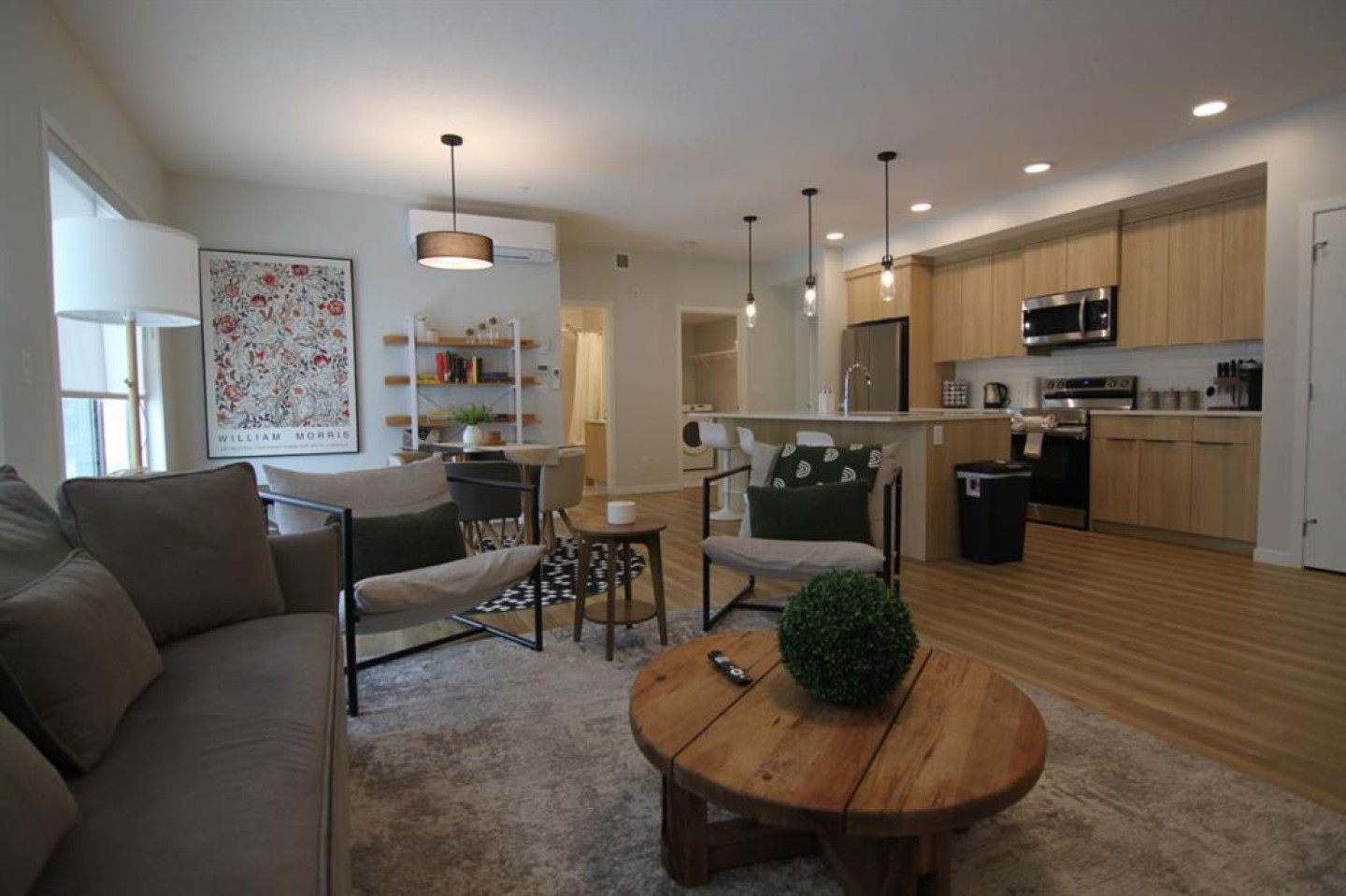 Step into a world of modern luxury with this pristine 2023-built corner residence, offering 1,055 sq. ft. of sophisticated living space. This air-conditioned 2-bedroom, 2-bathroom home is defined by its open-concept layout and designer upgrades. The gourmet kitchen is a chef’s dream, featuring a massive quartz island, premium built-in oven and microwave, and sleek cabinetry. The primary retreat is a sanctuary of its own, boasting a dedicated office nook, a spacious walk-in closet, and a spa-like 4-piece ensuite. Situated just steps from the South Health Campus, the world’s largest YMCA, and Seton’s vibrant dining scene, this unit combines the tranquility of a corner home with the convenience of an urban lifestyle. Complete with titled underground parking and a pet-friendly atmosphere, this is move-in-ready excellence at its finest.