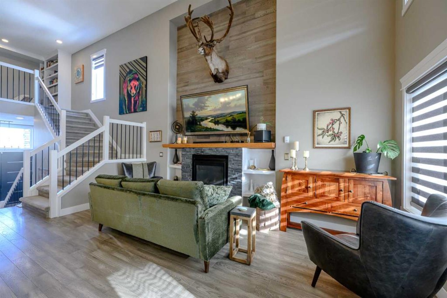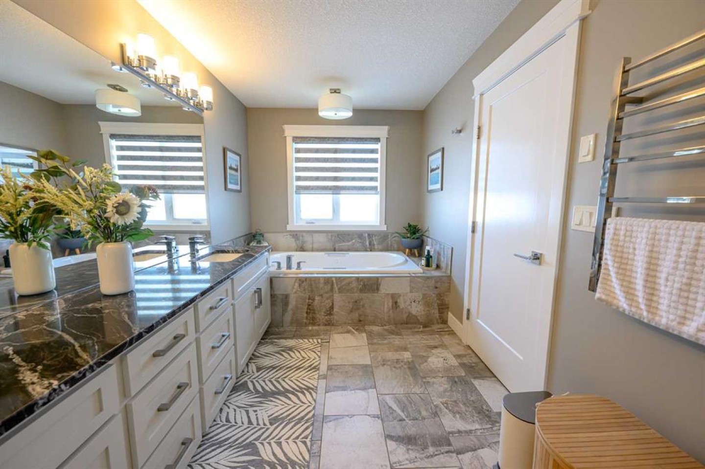 Upstairs you’ll find an impressive primary retreat complete with its own gas fireplace, a large walk-in closet with custom shelving, and a spa-like ensuite featuring a soaker tub, dual sinks, and a spacious walk-in shower.