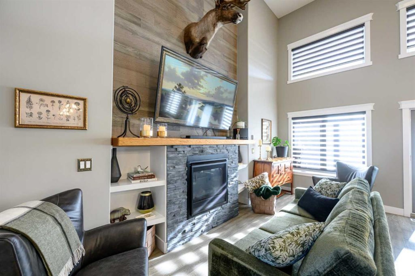 The bright main floor showcases soaring ceilings and an abundance of natural light. The beautifully appointed kitchen features quartz countertops, high-end appliances, and ample cabinetry and workspace — perfect for both everyday living and entertaining. The living room is warm and inviting with a gas fireplace and seamless access to indoor-outdoor gathering spaces, including a stunning heated three-season screened room.