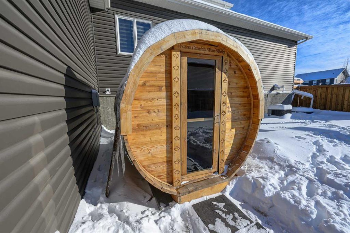 Additional features include air conditioning, custom window coverings, built-in speakers throughout the home and sunroom, a dog wash station, 4-person barrel sauna, and heated towel bars in the primary ensuite.