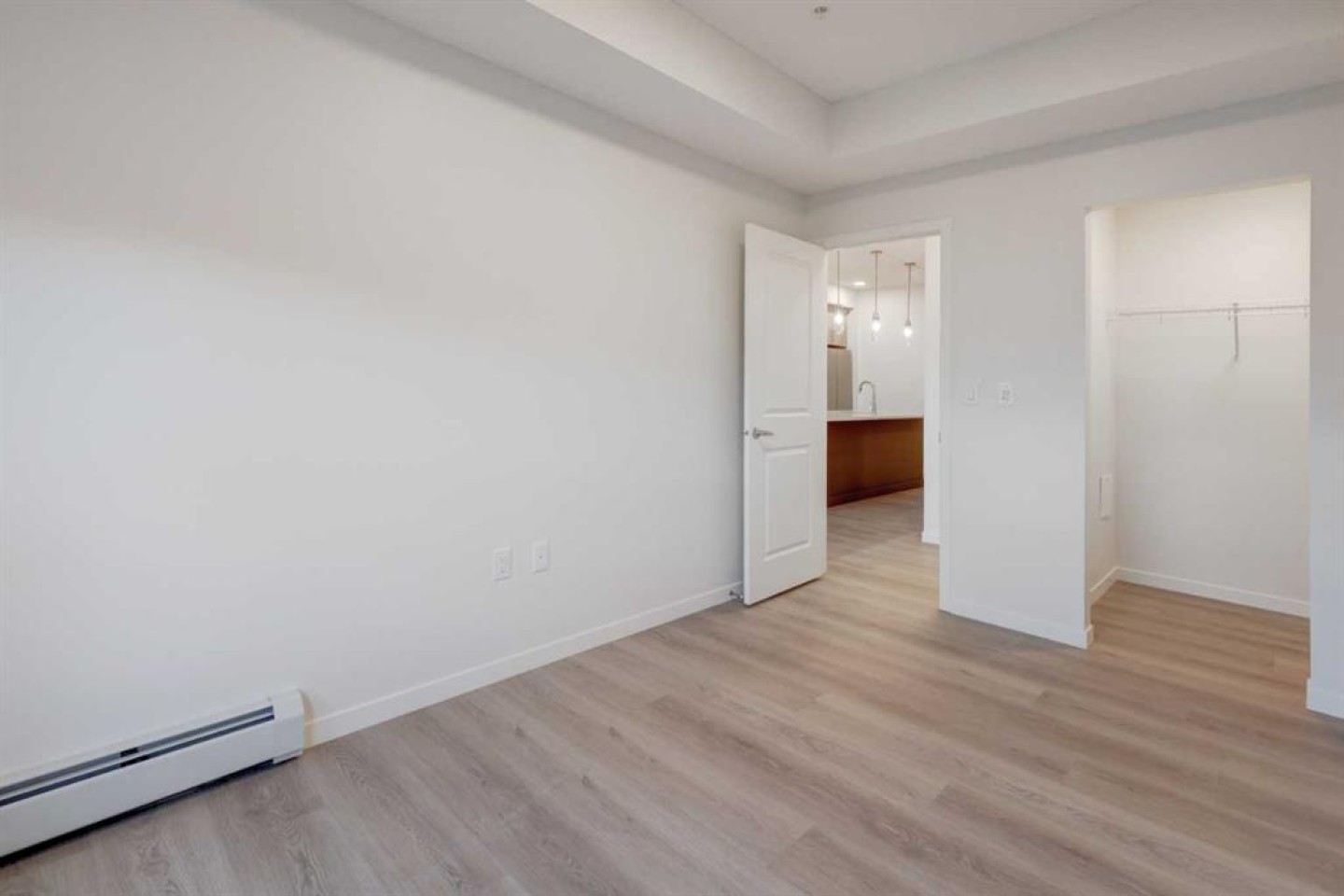 INTRODUCING GLACIER RIDGE, IN BEAUTIFUL NORTHWEST CALGARY. BUILT BY CEDARGLEN LIVING, WINNER OF THE Customer Insight BUILDER OF CHOICE AWARD, 6 YEARS RUNNING! BRAND NEW "GR04" unit with high-spec features. You will feel right at home in this well thought-out, 588.10 RMS sq.ft. 1 bed, 1 bath home with open plan, 9' ceilings, LVP flooring throughout (NO CARPET), Low E triple glazed windows, BBQ gas line on the patio, Fresh Air System (ERV), A/C rough-in, and so much more. The kitchen is spectacular with full height, two tone cabinets, quartz counters, upgraded bank of drawers for pots and pans, undermount sink, rough-in water line to the fridge and S/S appliances. The island is extensive with built in flush breakfast bar, which transitions into the spacious living area, perfect for entertaining. The spacious primary bedroom has a large bright window (triple pane windows) and sizeable walk-in closet. Right beside your bedroom is a 4pc bath with quartz counters, upgraded tiles to the ceiling, and undermount sink. Nearby is the spacious laundry/storage room, this is a must see (washer & dryer included). Highlights include: Hardie board siding, designer lighting package, sound reducing membrane to reduce sound transmission between floors, clear glass railing to balconies and 1 titled underground parking stall included. A once in a lifetime community in Northwest Calgary. Framed by views of the Rocky Mountains and distinguished by natural coulees that cross the land, Glacier Ridge offers a rare chance for families to live in a new community. PET FRIENDLY COMPLEX, IMMEDIATE POSSESSION AVAILABLE AND DON'T FORGET TO CHECK OUT THE VIRTUAL TOUR.
