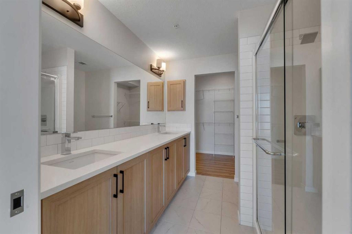 Step into modern living with this beautifully designed 2-bedroom condo featuring a bright, open floor plan and stylish contemporary finishes throughout. The spacious kitchen is the heart of the home, showcasing a huge island perfect for entertaining, quartz countertops, stainless steel appliances, and ample cabinetry to keep everything organized. Durable vinyl plank flooring flows seamlessly through the main living areas, creating a warm and cohesive feel. The primary suite offers a private retreat complete with a walk-in closet and a luxurious 4-piece ensuite featuring a double vanity. A generously sized second bedroom provides flexibility for guests, a home office, or additional living space. You’ll also appreciate the rare bonus of a large laundry room with extra storage potential. Enjoy the convenience and security of titled underground parking, along with the low-maintenance lifestyle this modern condo provides. Ideal for professionals, downsizers, or investors, this home combines comfort, function, and contemporary design in one exceptional package.