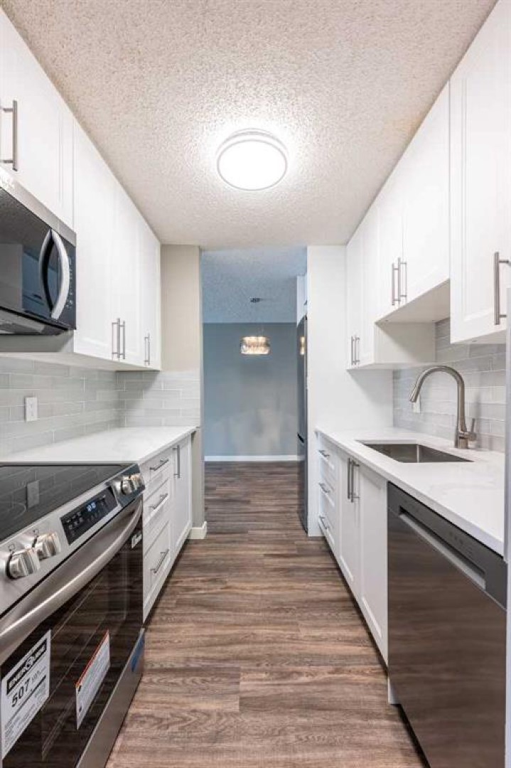 This upgraded, south-facing unit features a full-length balcony—perfect for morning coffee in the sun or evening BBQs. Large, newer windows fill the home with natural light. The NEWLY RENOVATED KITCHEN showcases quartz countertops along with a brand new dishwasher, electric stove, and microwave hood fan, all set atop vinyl plank flooring that extends through the kitchen, dining area, foyer, and bathroom for a stylish and durable finish.