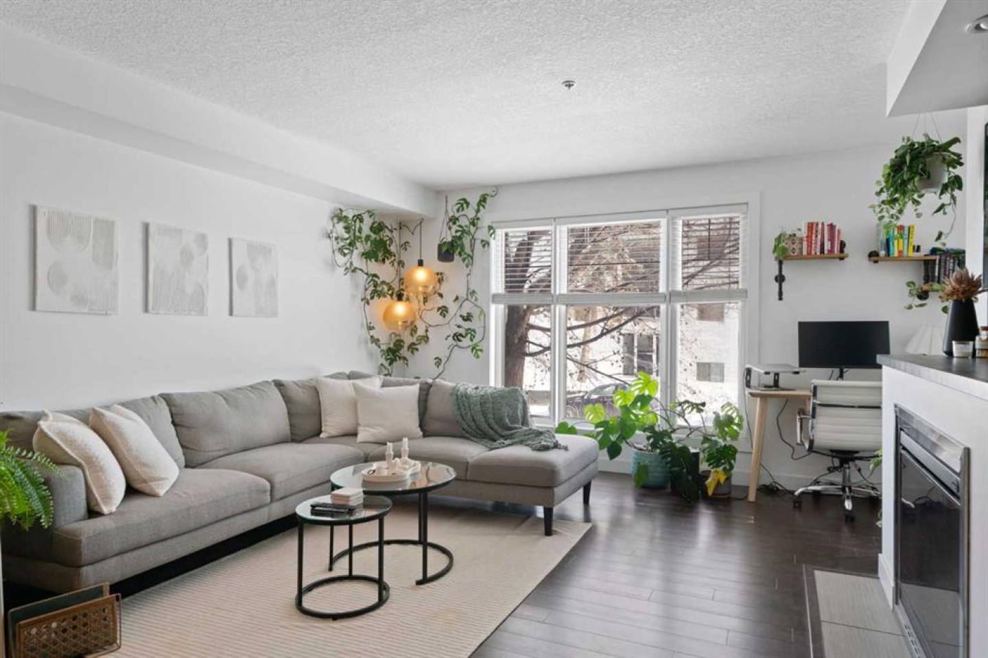 Welcome to this beautifully upgraded condo in one of Calgary's most sought-after inner-city neighbourhoods. Thoughtfully designed with a modern open-concept layout, this home immediately impresses with rich hardwood floors, soaring windows that flood the space with natural light, and a cozy gas fireplace that anchors the living room.