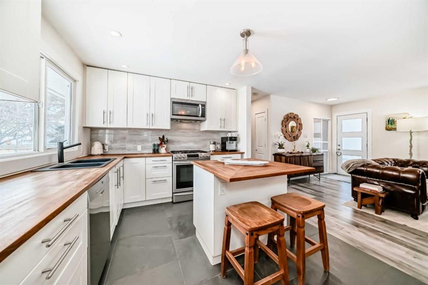 The main floor features two bedrooms including the primary with a 3 piece ensuite. The kitchen overlooks the backyard and includes white cabinetry, stone backsplash, butcher block countertops and updated appliances.