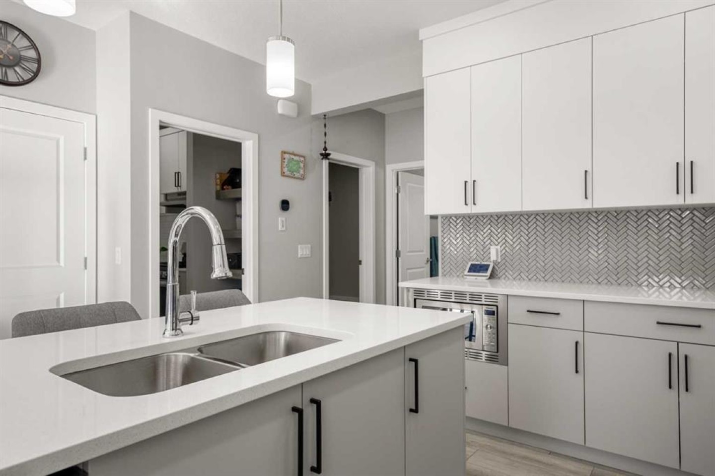 The kitchen is well suited for both everyday living and entertaining, with extensive cabinetry and a complete appliance package that includes an electric stove, refrigerator, microwave, and chimney-style hood fan. For added functionality, there is also a separate spice kitchen equipped with a gas stove, allowing for meal preparation while keeping the main kitchen tidy.